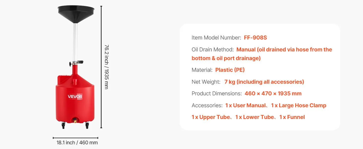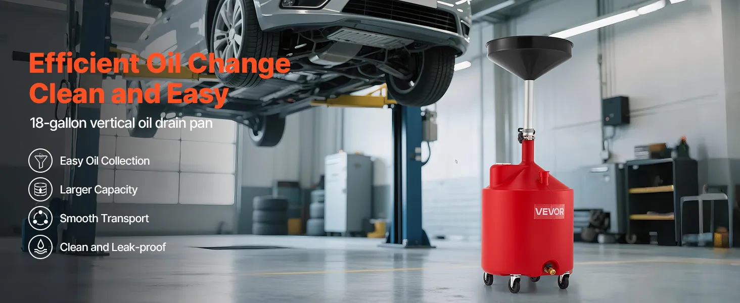 • Liela ietilpība: 68 L eļļas savākšanas tvertne piemērota vairākkārtējai eļļas nomaiņai. Darbojas gravitācijas vai manuālajā režīmā, nodrošinot ātru un tīru eļļas noteci. Ideāli piemērota automašīnu, SUV un kravas auto apkopei mazos un vidējos servisos.