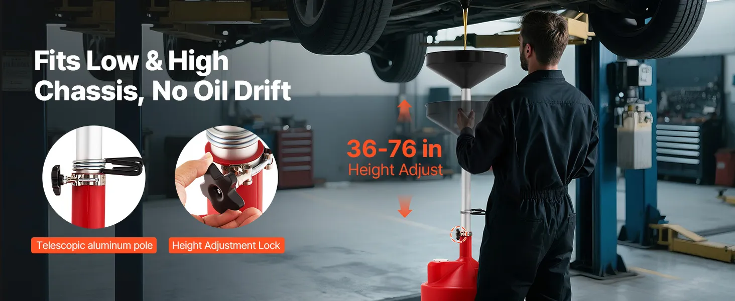 • Regulējams augstums: Regulējams piltuves augstums 91–193 cm diapazonā nodrošina piemērotību dažādiem transportlīdzekļiem un ciešu savienojumu bez noplūdēm.