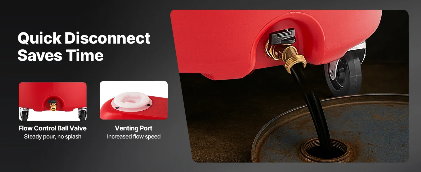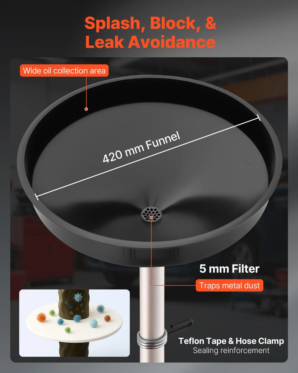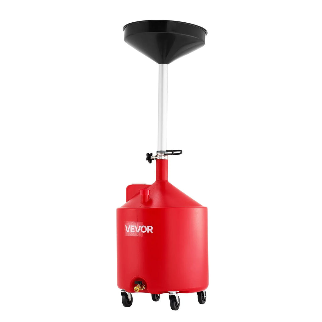 Atkritumeļļas savākšanas tvertne 68 L, regulējama piltuves augstuma eļļas noteces tvertne ar riteņiem, pārnēsājama industriālā šķidrumu savākšanas un pārsūknēšanas iekārta auto darbnīcām un garāžām, sarkana