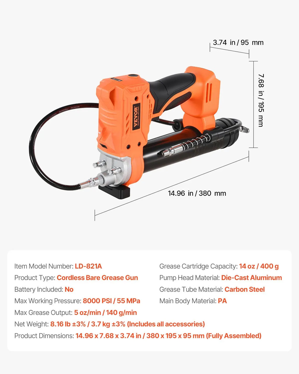 Smērvielas kasetnes ietilpība: 400 g (14 unces)