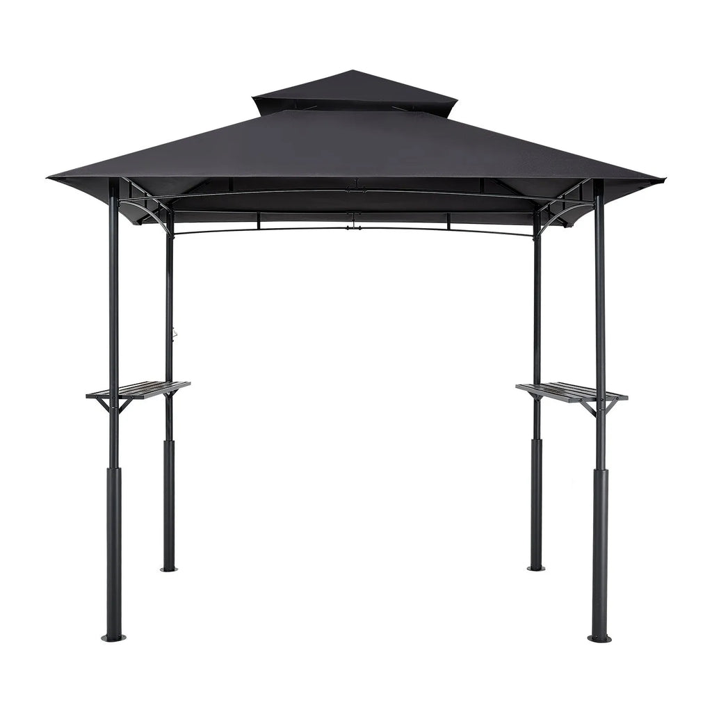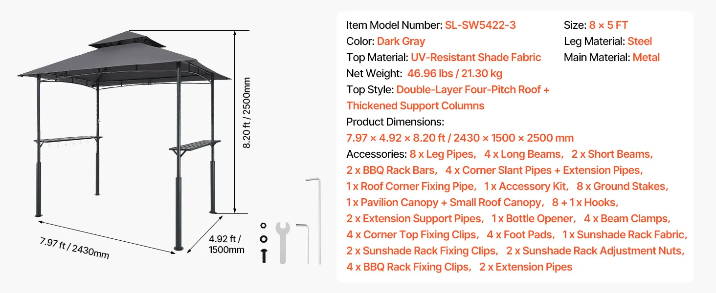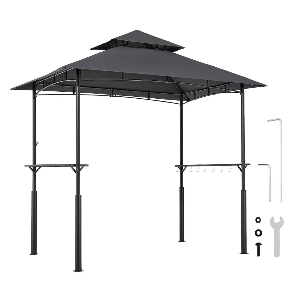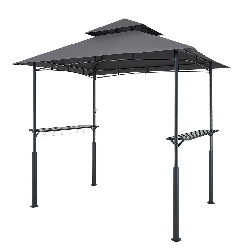 Divslāņu jumts: Nojume ir aprīkota ar divslāņu auduma jumtu, kas veicina gaisa cirkulāciju un ātri novada grilēšanas dūmus. Izgatavota no augstas kvalitātes saules starus bloķējoša auduma, tā pasargā no UV starojuma un neliela lietus, radot patīkamu un vēsu āra telpu vēl patīkamākai grilēšanas pieredzei.