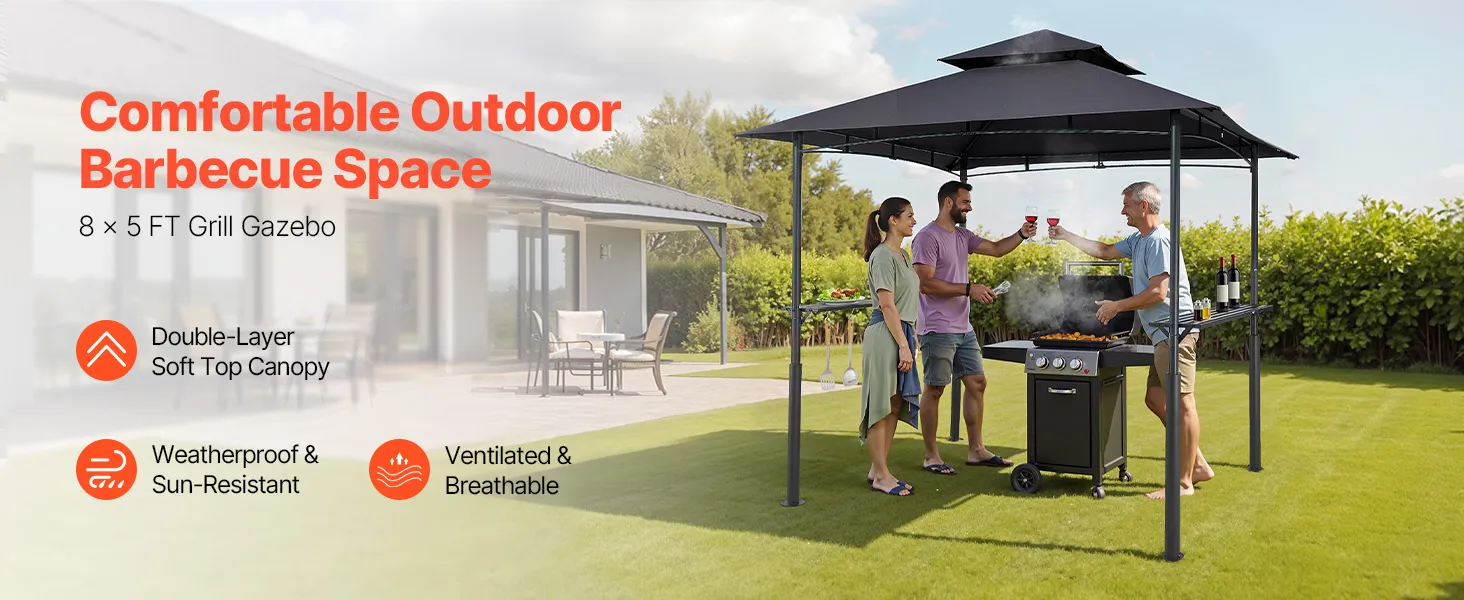 Plaša vieta grilēšanai: Grila nojume ar izmēriem 2,43 × 1,5 m piedāvā pietiekami daudz vietas 2–4 cilvēkiem, lai grilētu, sarunātos un baudītu brīdi kopā. Neatkarīgi no tā, vai gatavo, sagatavo produktus vai novieto galdus un krēslus – šī plašā nojume nodrošina ērtību bez drūzmēšanās. Ideāla āra kopā sanākšanai.