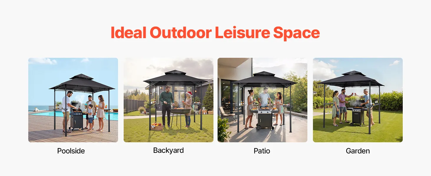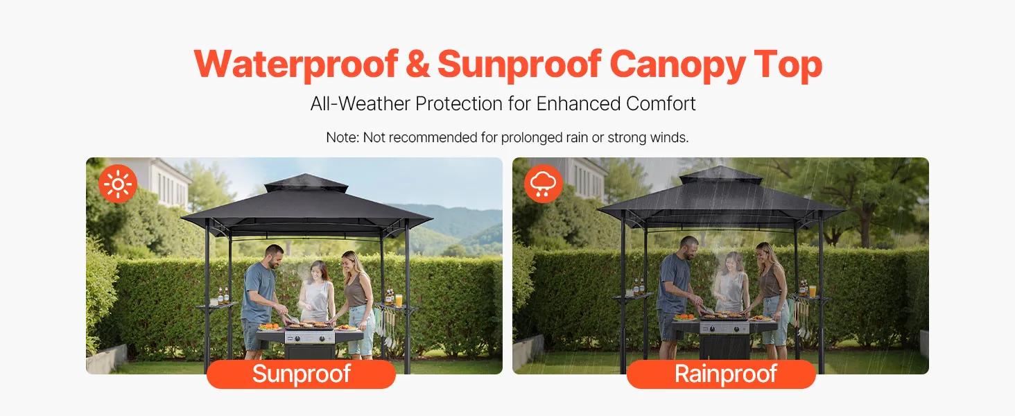Piemērota jebkuriem laikapstākļiem: No terasēm un klājiem līdz baseina zonām un dārziem – šī BBQ nojume ir lielisks risinājums jautrībai pagalmā. Neatkarīgi no tā, vai rīkojat nedēļas nogales grilēšanu, ģimenes pikniku vai āra svinības, nojume nodrošina aizsardzību un komfortu gan saulē, gan lietū.