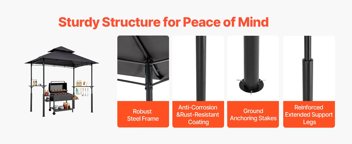 Ilgmūžīga konstrukcija: Izgatavota no pulverkrāsota Q235 tērauda rāmja, kas nodrošina aizsardzību pret rūsu, deformācijām un laikapstākļu ietekmi. Pastiprinātās un pagarinātās kājas piešķir papildu stabilitāti, savukārt stiprinājuma plāksnes un mietiņi nodrošina drošu pamatni. No saulainām dienām līdz vējainiem vakariem – šī nojume paliek stabila un uzticama jebkuros apstākļos.