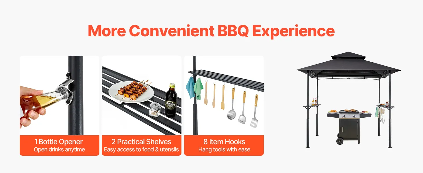 Pārdomāti dizaina risinājumi: Nojumei ir divi sānu plaukti ērtai garšvielu un trauku novietošanai, kā arī 8 āķi BBQ piederumiem. Iebūvētais pudeļu attaisāmais ļauj ērti atvērt dzērienus, padarot grila staciju pilnībā aprīkotu – no sagatavošanas līdz svinībām.