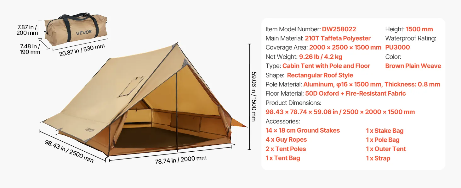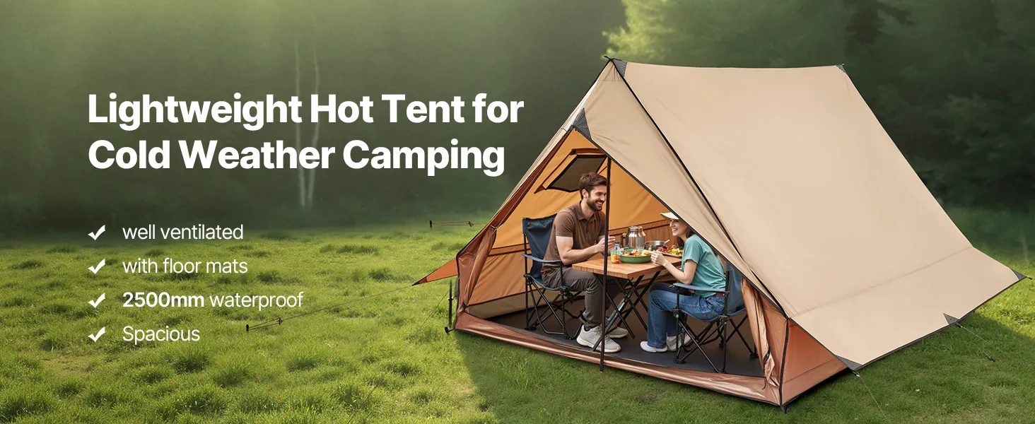 Ar izmēriem apmēram 2500 × 2000 × 1500 mm šī karstā telts ar plīts izvadu nodrošina plašu un ērtu vietu diviem pieaugušajiem.