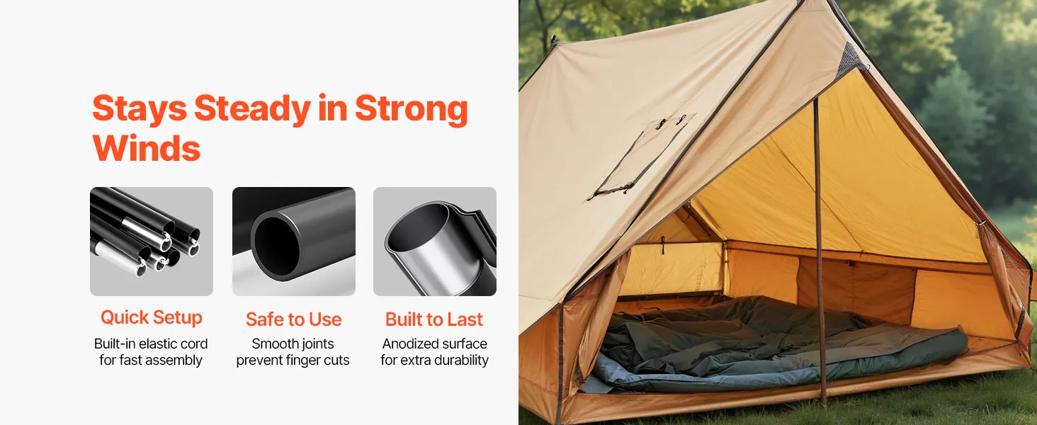 Kempinga karstā telts ar izturīgu karkasu nodrošina uzlabotu stabilitāti un lielisku noturību pret vēju un lietu, garantējot drošību dažādos laikapstākļos.