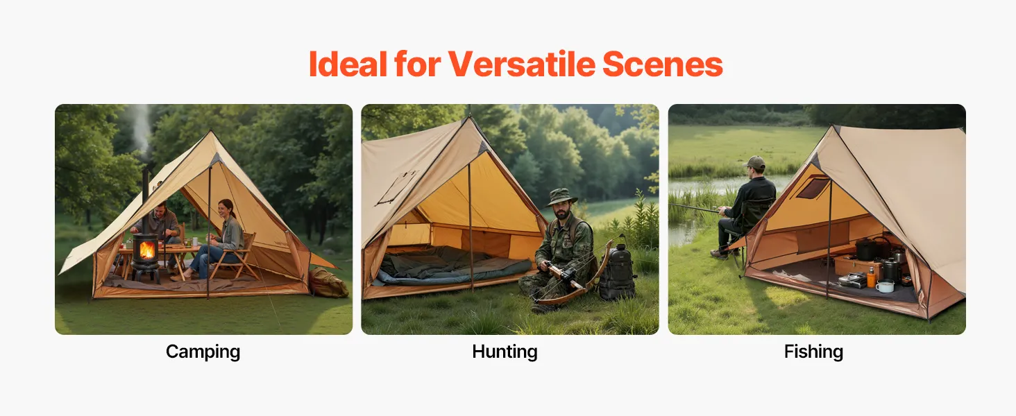 Šī ziemas karstā telts ir ideāli piemērota ģimenes kempingiem, grupu izbraucieniem un brīvdabas atpūtai — nodrošina pilnīgu aizsardzību un komfortu dažādos āra apstākļos.