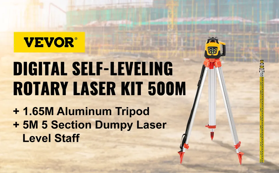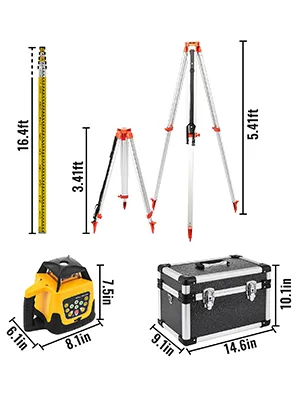 Šis lāzera līmeņa instrumentu komplekts sastāv no lāzera līmeņa, 1,65 m statīva un 5 m mērstieņa, kas izgatavoti no izturīgiem, bet viegliem plastmasas un alumīnija materiāliem. Ar 500 m darba attālumu un 360 grādu rotācijas konstrukciju šis lāzera līmenis nodrošina stabilas skenēšanas līnijas maksimālai redzamībai dažādos apgaismojuma apstākļos. Statīvs ar regulējamu augstumu un līdzenu pamatni spēj noturēt vairākas mērīšanas ierīces dažādiem izlīdzināšanas un mērīšanas darbiem. Mūsu produkti ir piemēroti celtniecībai, dzelzceļa, ceļu uzturēšanas un citiem āra darbiem.
