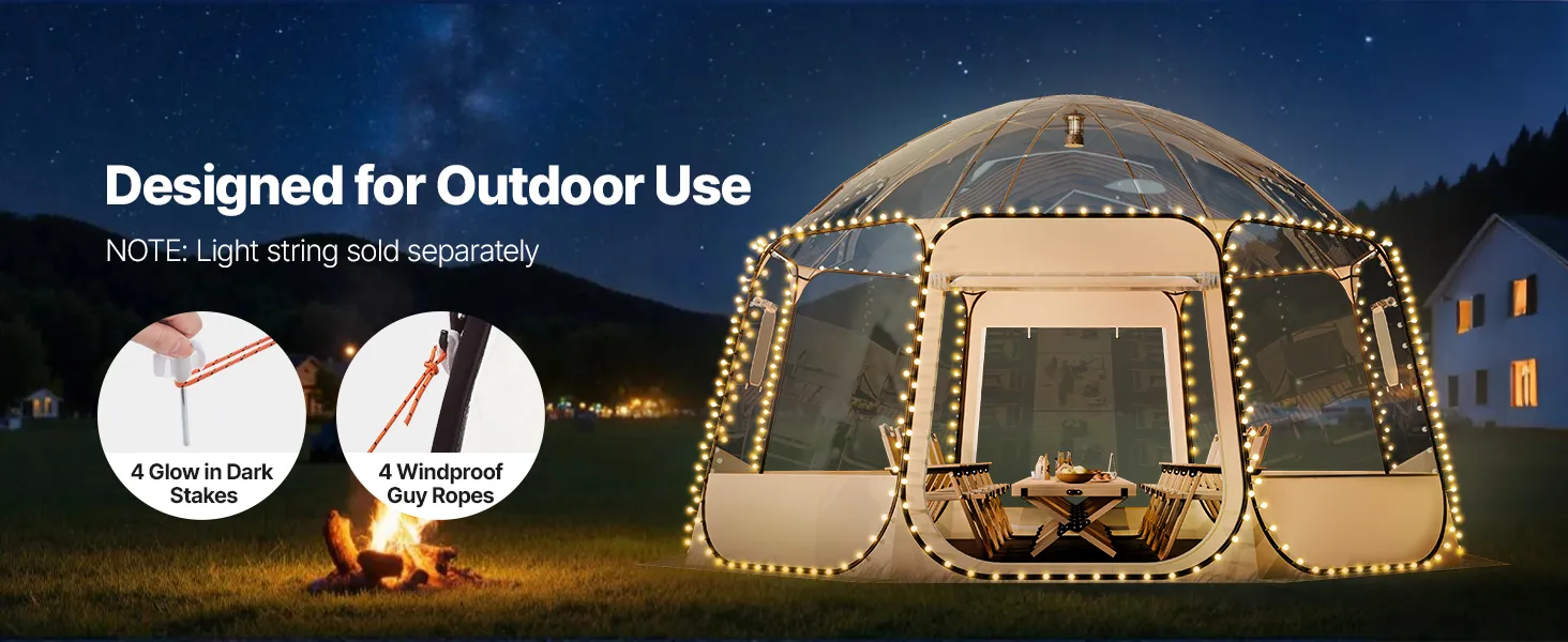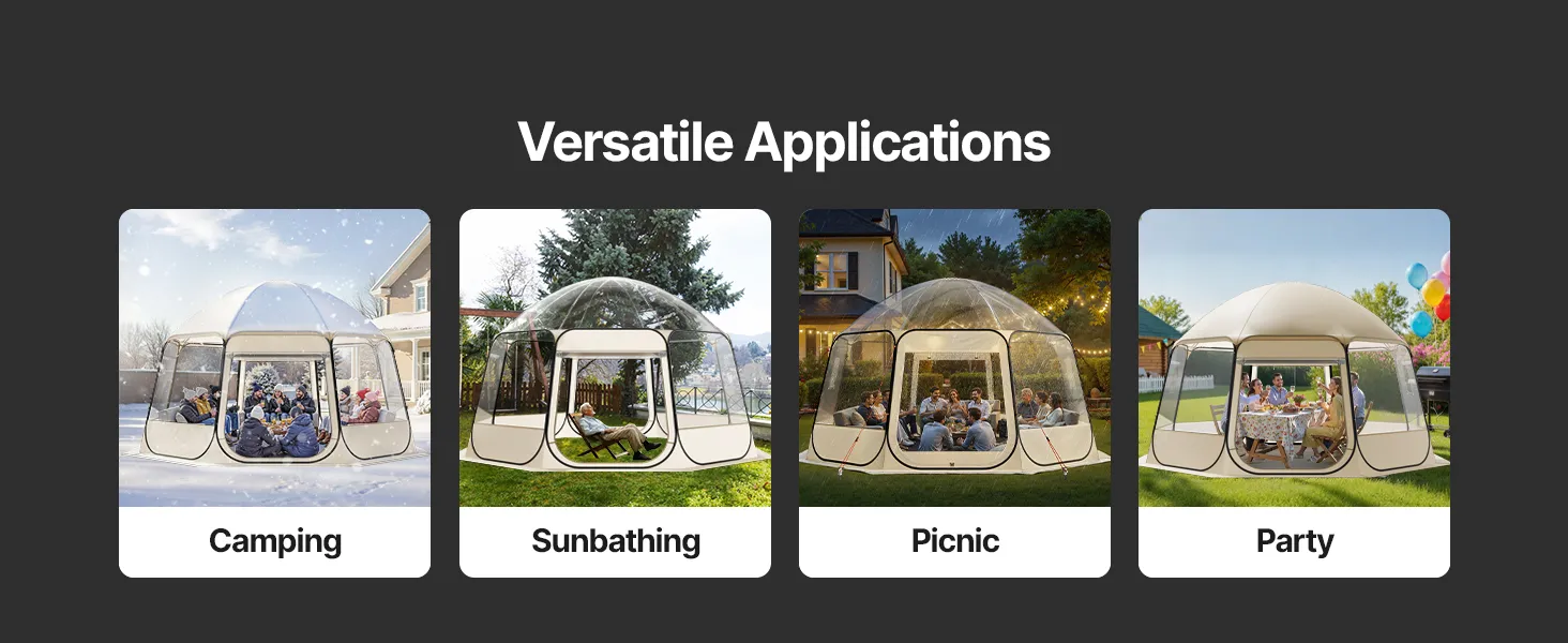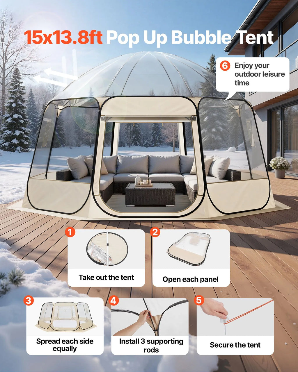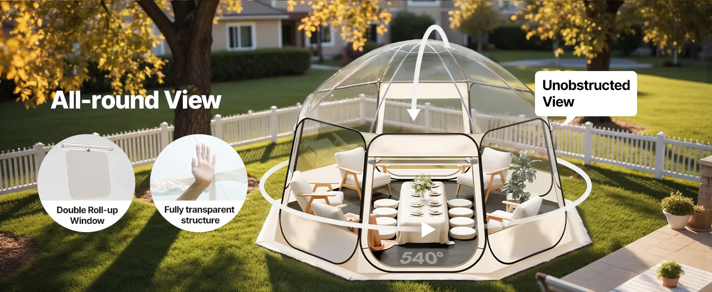Uzpūšama caurspīdīga konstrukcija: Šī kupola tipa uzpūšamā telts tiek uzstādīta dažu sekunžu laikā, pateicoties ātrās uzstādīšanas mehānismam. Izbaudi 540° panorāmas skatu un pilnībā saplūsti ar apkārtējo dabu. Piezīme: šī telts ir piemērota vēsākam rudenim un ziemai, nav ieteicama lietošanai karstā laikā.
