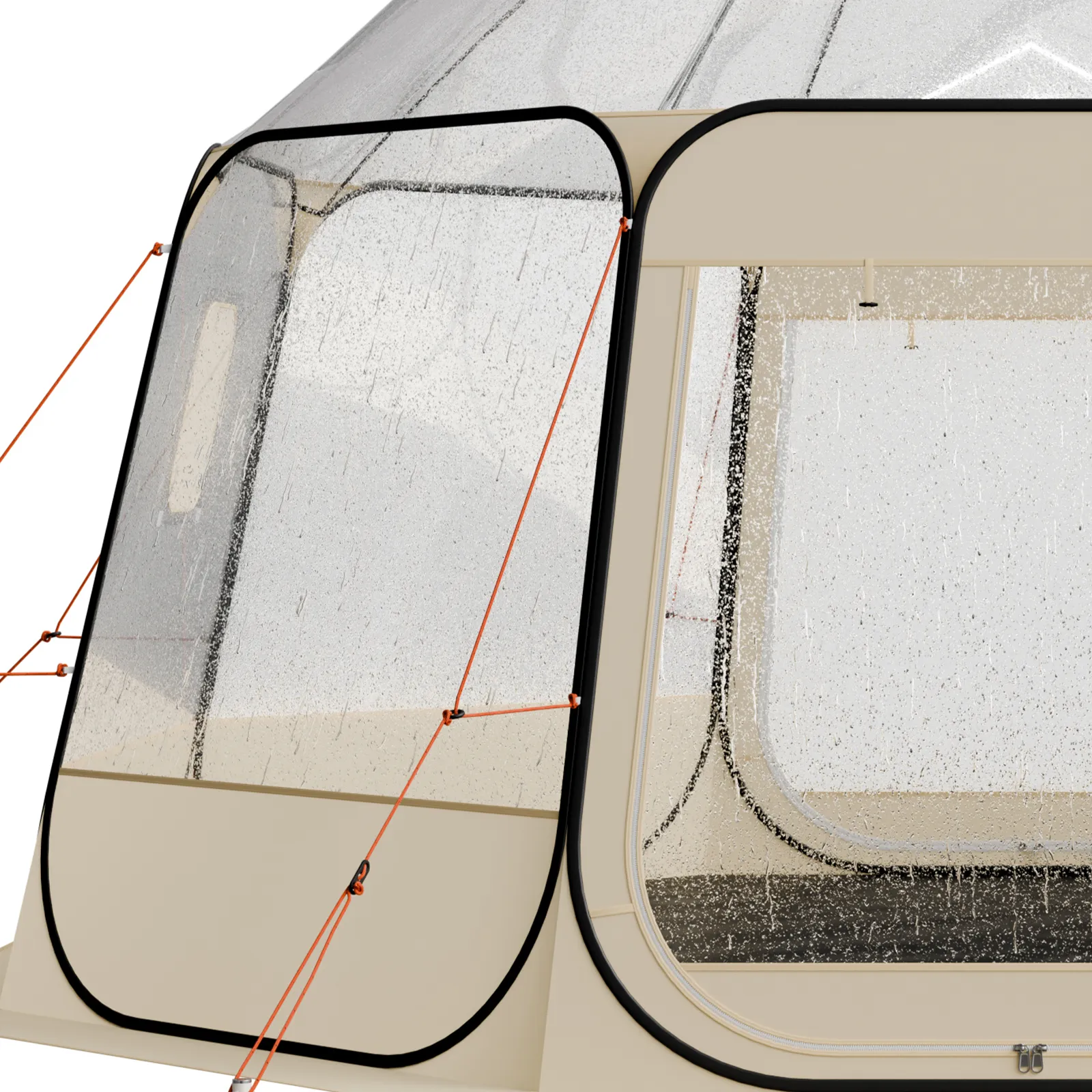 Divi paceļami logi: Caurspīdīgajai teltij ir divi sānu paceļami logi, kas ļauj regulēt ventilāciju un privātumu, nodrošinot optimālu gaisa plūsmu un ērtu atpūtu brīvā dabā.