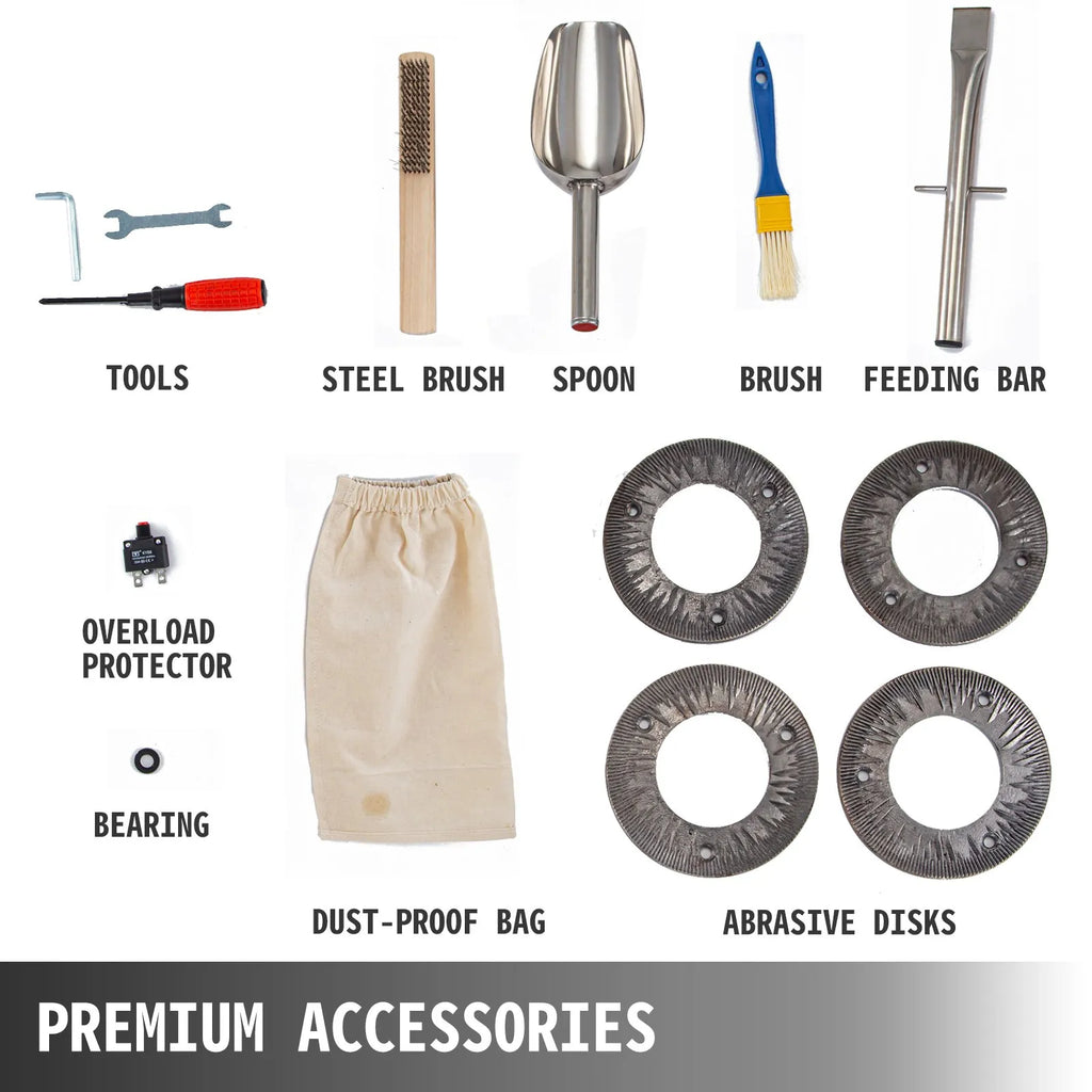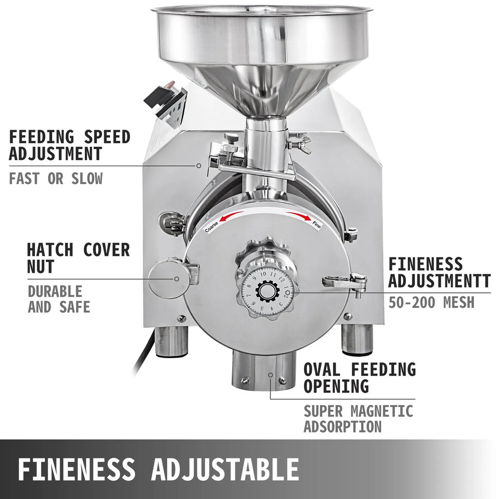 VEVOR 2,2 kW komerciālā graudu malšanas iekārta, elektriskās graudu dzirnaviņas ar jaudu 30–50 kg/h, 50 kg ietilpības pulvera malšanas iekārta no nerūsējošā tērauda, piemērota sausu graudu, sojas pupu, garšvielu un kafijas malšanai