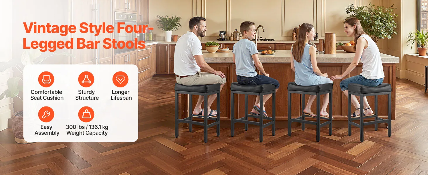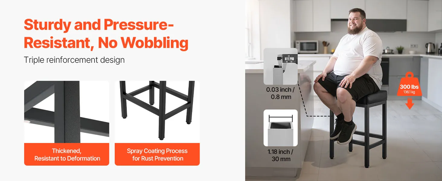 Izturīga un stabila konstrukcija: Bāra krēsli izgatavoti no biezinātām dzelzs caurulēm ar stabilu struktūru, nodrošinot maksimālo slodzi līdz 136 kg. Kājas pārklātas ar pulverkrāsojumu, kas pasargā no rūsas un skrāpējumiem, nodrošinot ilgu kalpošanas laiku.