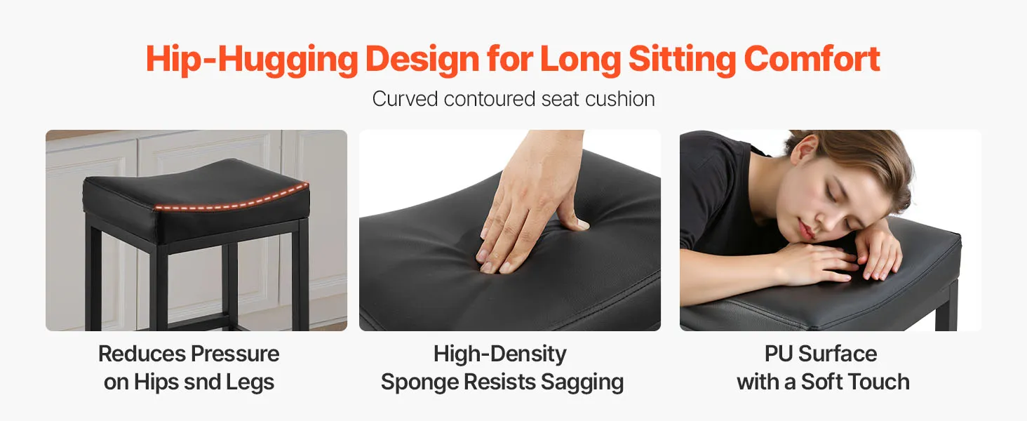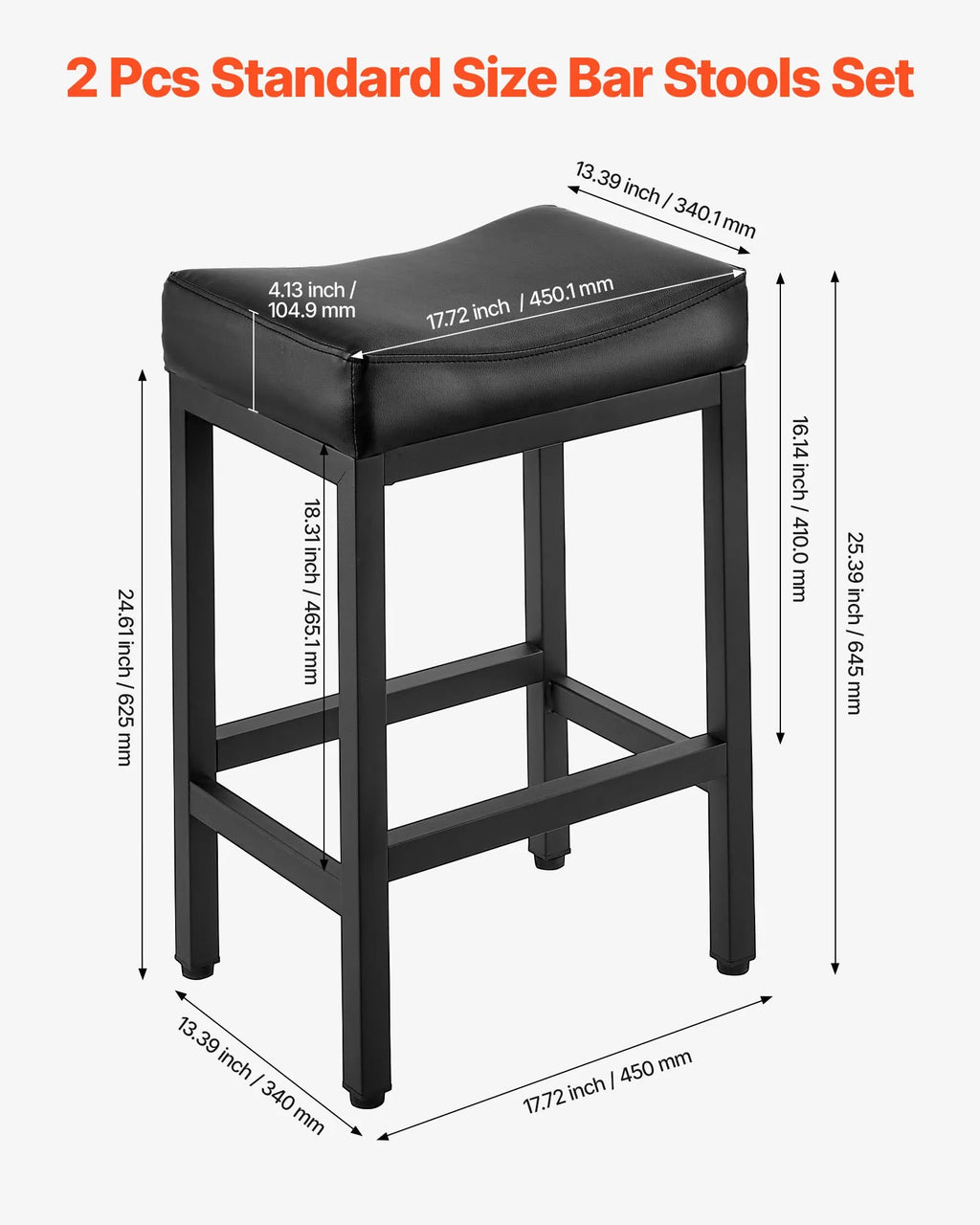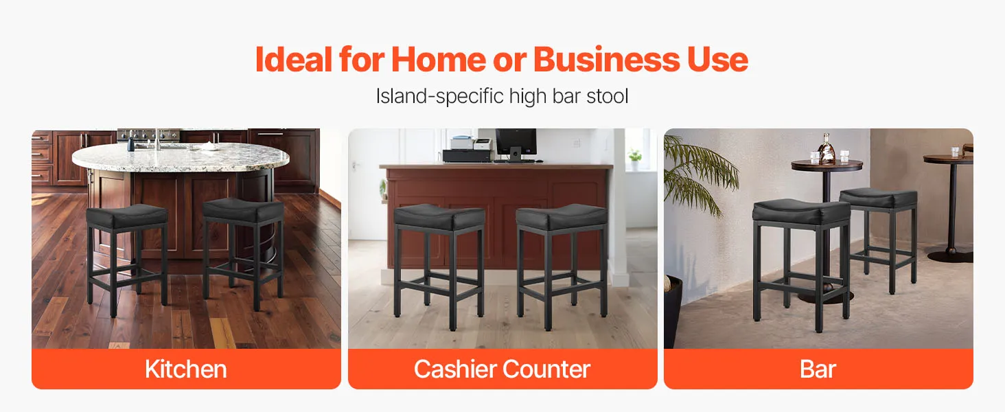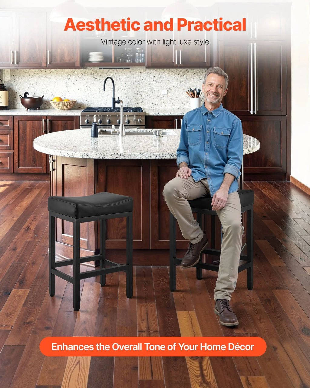 Elegants un daudzpusīgs dizains: Melnā PU āda kombinācijā ar plūdlīniju metāla konstrukciju rada vieglas luksusa sajūtu. Krēsli piemēroti gan mājas, gan komerciālām telpām, un to augstums lieliski sader ar standarta bāra letēm un virtuves saliņām.