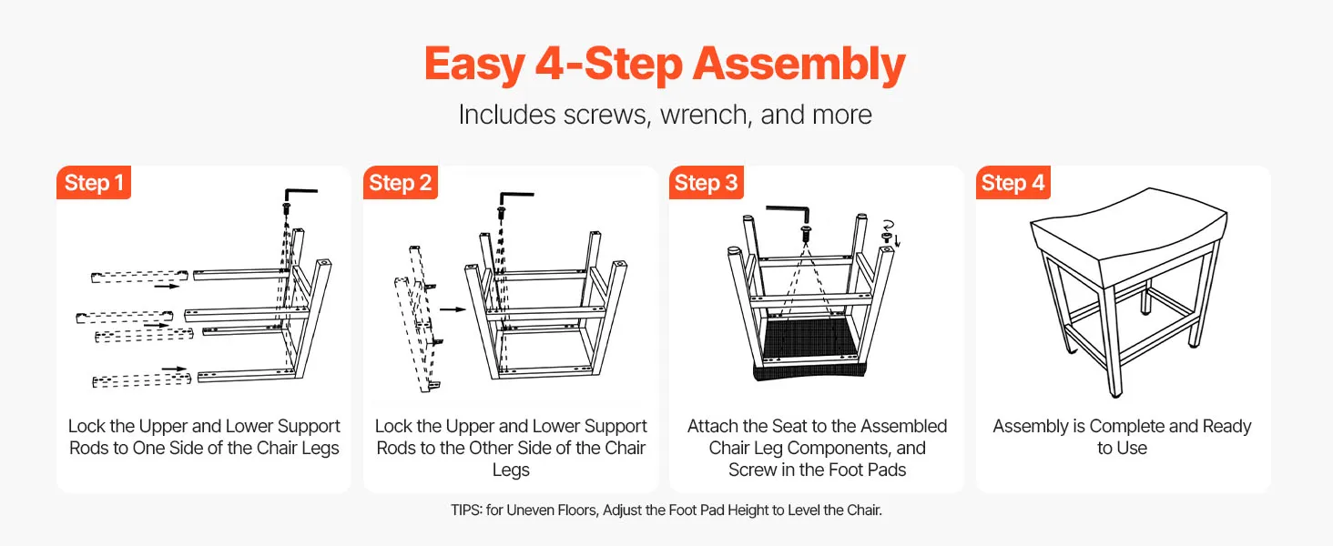 Montāžu var pabeigt tikai 4 vienkāršos soļos, neizmantojot elektriskos instrumentus. Komplektā iekļauti visi nepieciešamie rīki, kas nodrošina ērtu un ātru salikšanu, ietaupot jūsu laiku un pūles. Pat iesācēji var viegli salikt krēslus un baudīt bezrūpīgu lietošanas pieredzi.