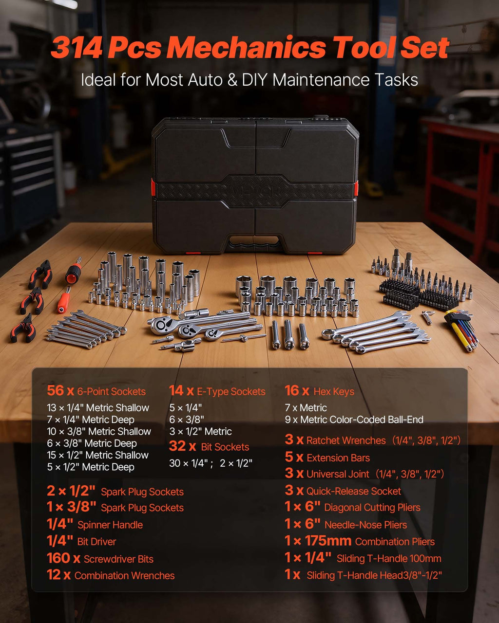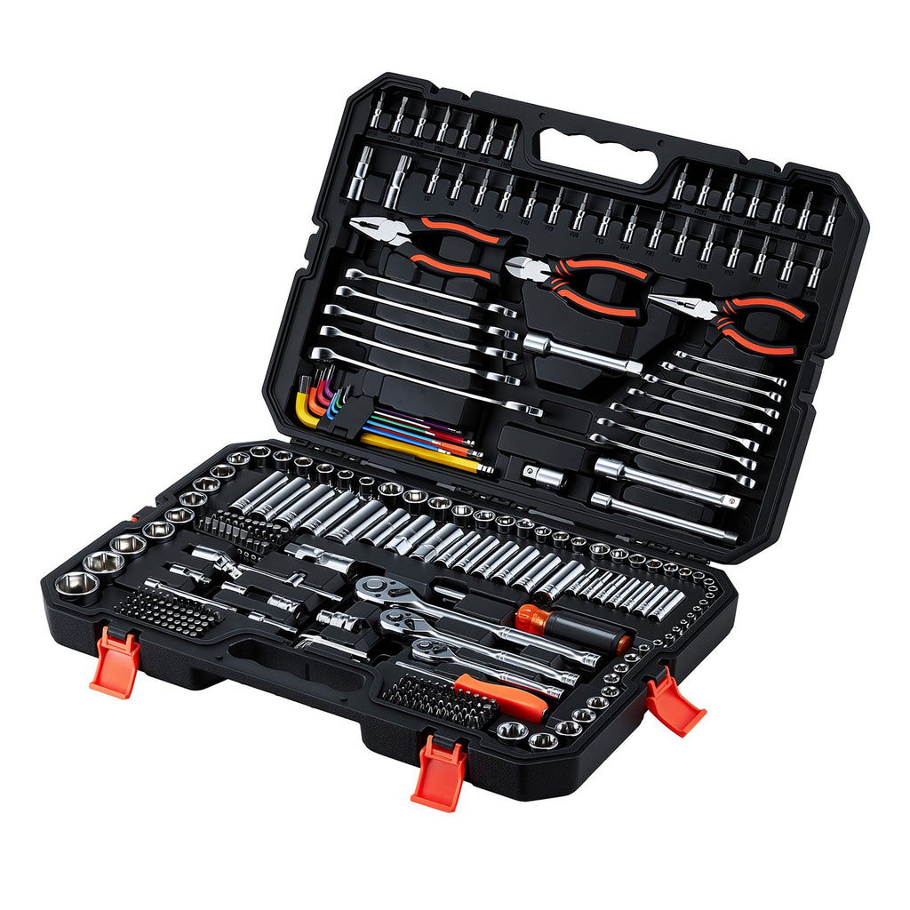 Universāls instrumentu komplekts: Šis 314 daļu mehāniķa instrumentu komplekts apvieno svarīgākos instrumentus auto remontam, mājas uzlabošanas darbiem, santehnikas darbiem un DIY projektiem — viss vienā daudzfunkcionālā komplektā.