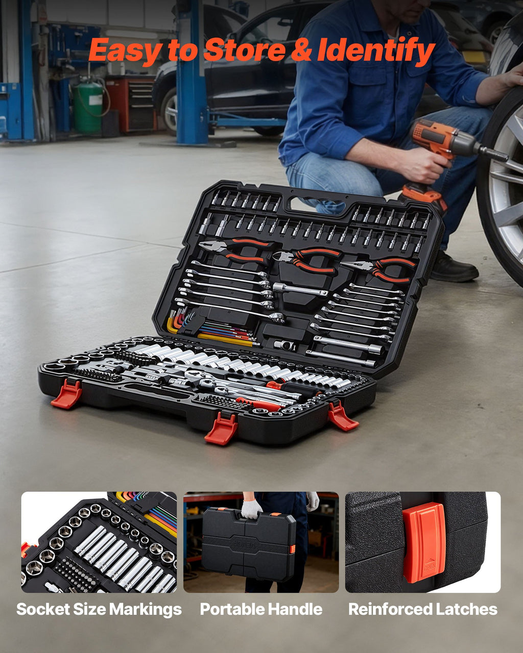 Ērts pārnēsāšanas rokturis Šis mehāniķa instrumentu komplekts ir aprīkots ar uzglabāšanas koferi ar izturīgu un ērtu rokturi, kas nodrošina vieglu pārnēsāšanu.