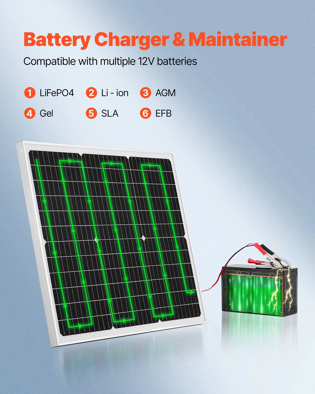Saderīgs ar dažāda veida 12 V akumulatoriem, tostarp LiFePO4, litija jonu, AGM, Gel, SLA un EFB. Piemērots novietošanai uz līdzenas virsmas pagalmā, uz jumtiem vai transportlīdzekļiem ar plakanu jumtu. Plaši izmantojams laivām, kemperiem, automašīnām, piekabēm, motocikliem, zāles pļāvējiem, ūdens sūkņiem, vārtu piedziņām, instrumentu nojumēm u.c.