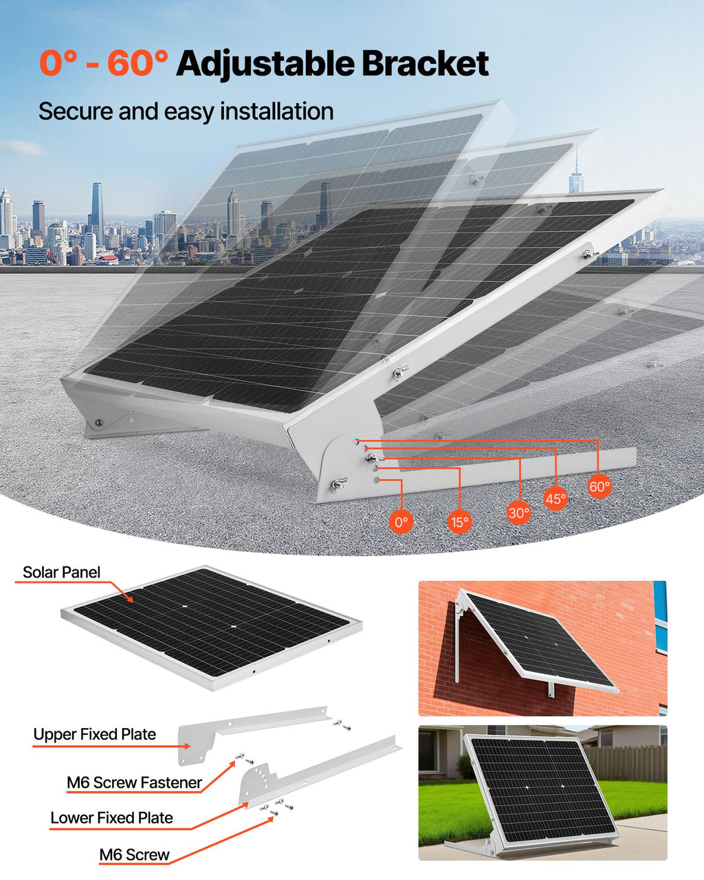 Šis saules paneļa akumulatora uzlādes komplekts ir aprīkots ar regulējamu montāžas kronšteinu 0°–60° diapazonā, M6 skrūvēm un iepriekš izurbtiem montāžas caurumiem drošai ilgtermiņa uzstādīšanai uz sienām, laivu klājiem, automašīnu jumtiem, māju jumtiem un citām virsmām, nodrošinot nepārtrauktu elektroapgādi jūsu aprīkojumam.