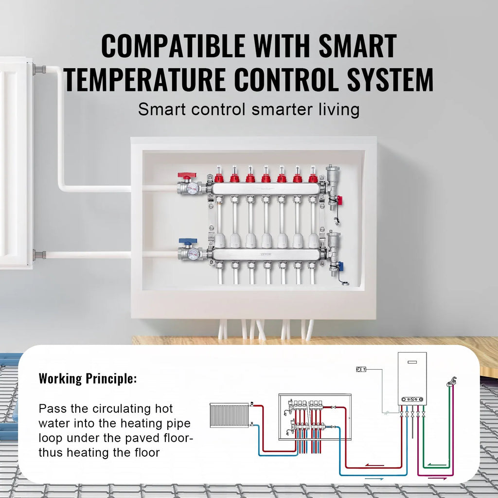 Efektīva apkure sākas šeit: Izstrādāts grīdas apkures sistēmām, šis hidrauliskais starojuma apkures kolektors nodrošina vienmērīgu un stabilu siltuma sadali visā telpā. VEVOR starojuma apkures PEX kolektors ir piemērots gan dzīvojamām, gan komerciālām telpām, nodrošinot uzticamu darbību un optimālu apkures efektivitāti.