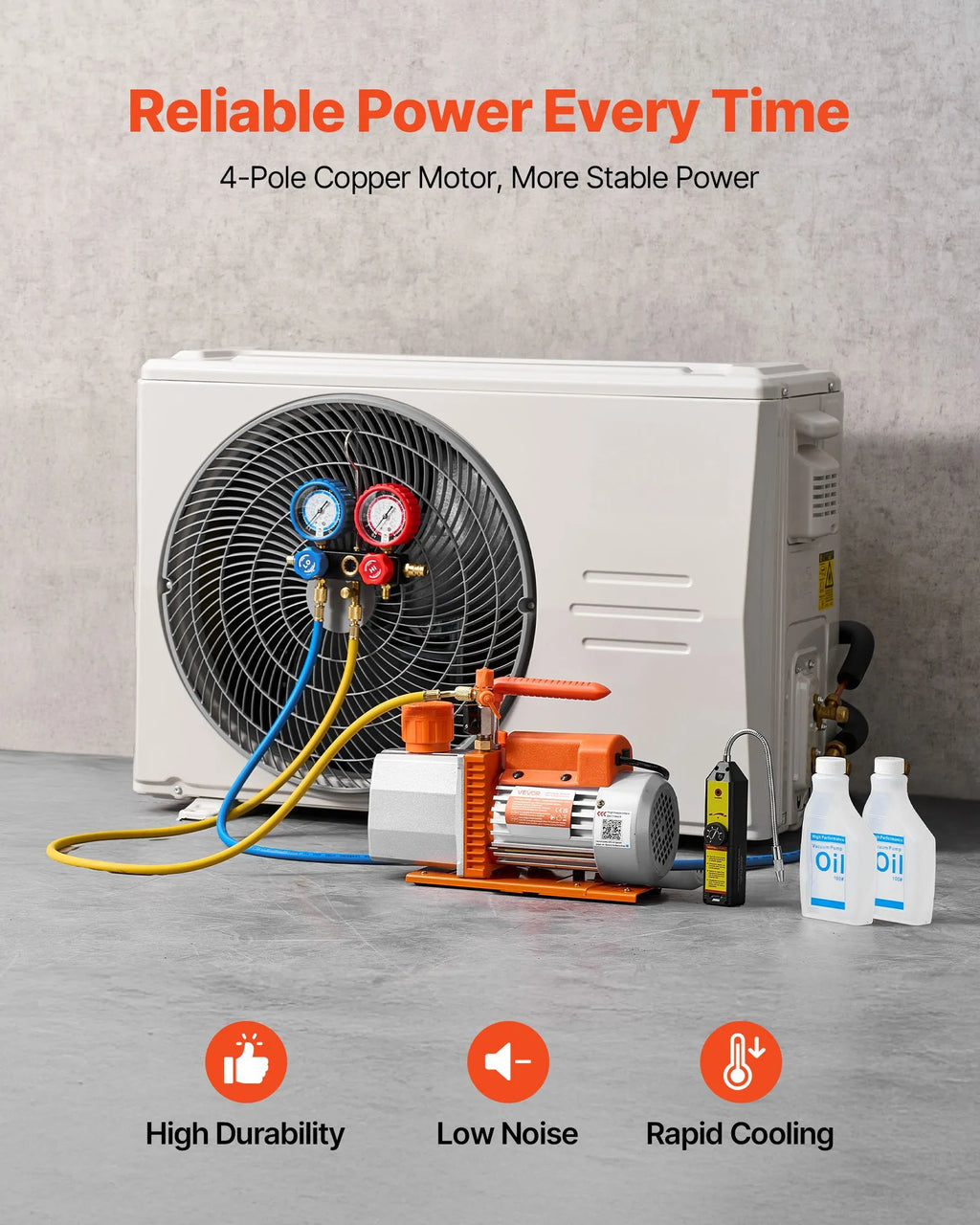 A: Sūknis ir aprīkots ar divpakāpju rotācijas lāpstiņu konstrukciju un plūsmas ātrumu 198 l/min, kas ir ideāli piemērots mājas gaisa kondicionēšanas sistēmām. Tas sasniedz vakuuma līmeni < 30 Pa un ir piemērots R134a, R22, R410a un citiem nedegošiem aukstumaģentiem.