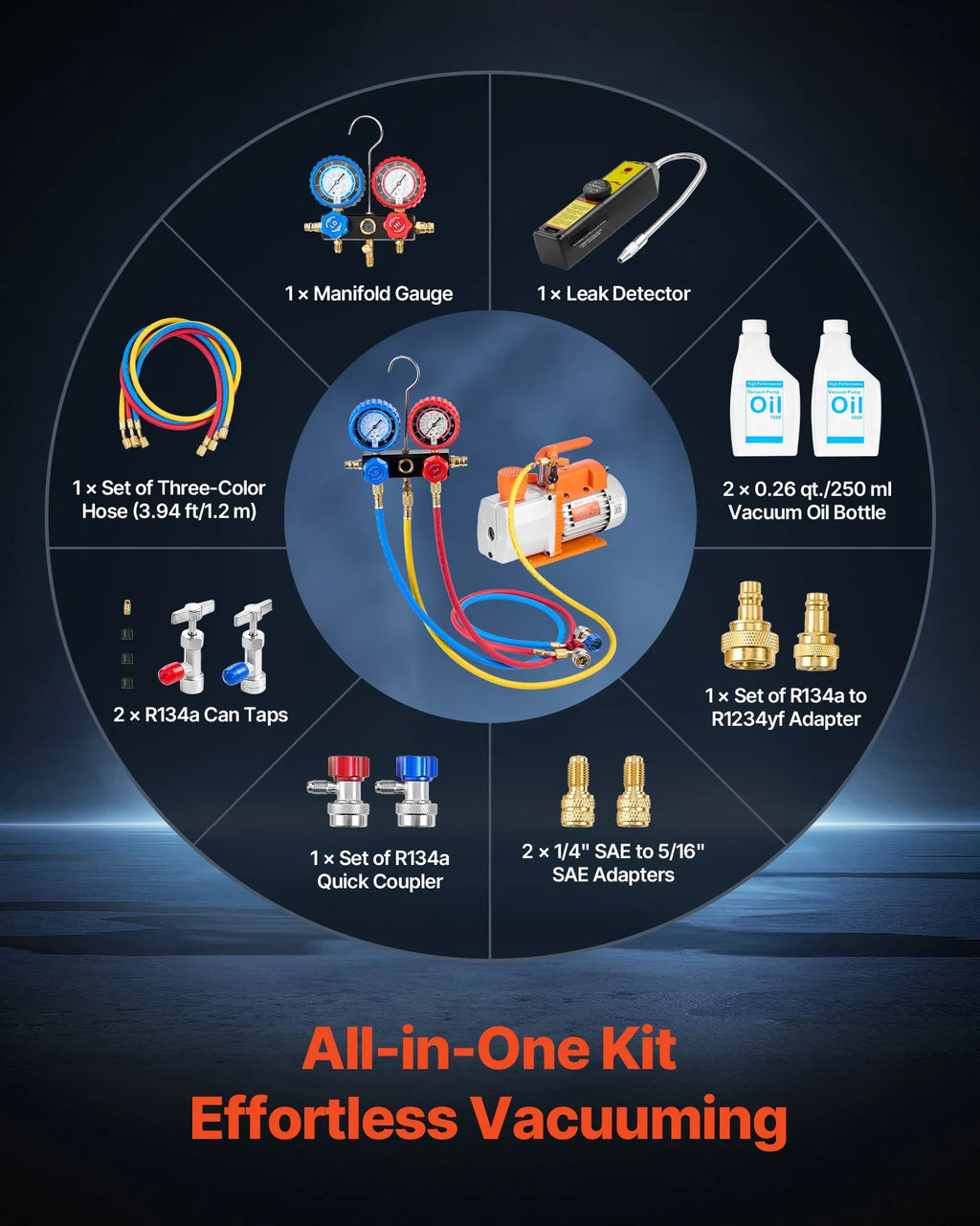 Pilns komplekts tūlītējai lietošanai: Ietver vakuuma sūkni, manometru kolektoru, trīs krāsu šļūteni, R134a → R1234yf adapteri, R134a ātro savienotāju, R410a adapteri (SAE 1/4 → SAE 5/16), R134a balona vārstus, noplūžu detektoru, 250 ml vakuuma eļļas pudeli un pārnēsājamu somu.