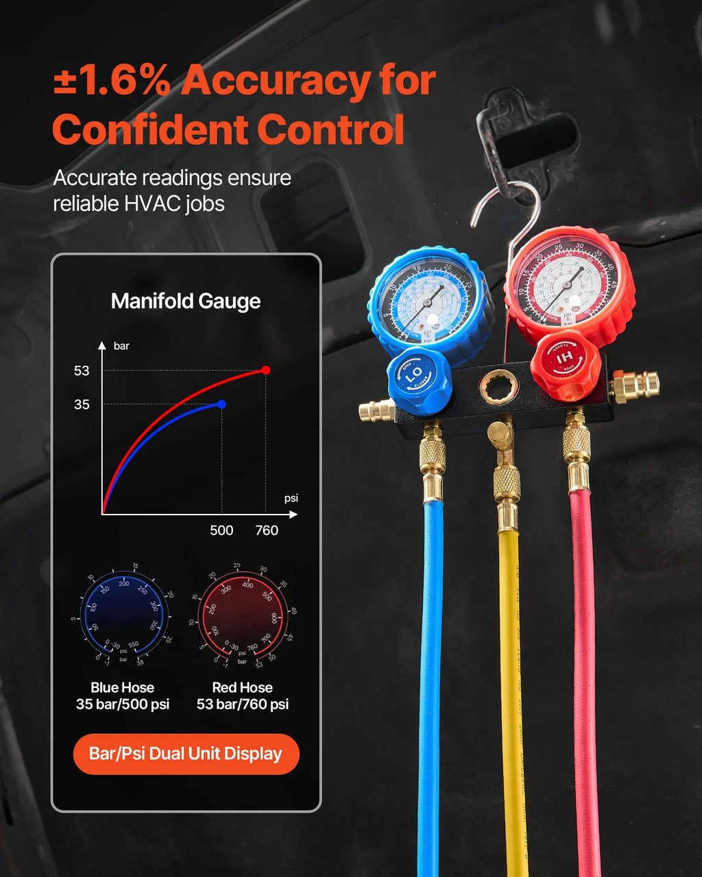 Precīza spiediena uzraudzība: Uzlabots profesionāls manometru kolektors nodrošina ±1,6 % mērījumu precizitāti un augstu spiediena izturību. Divvienību displejs ar skaidru skata lodziņu ļauj ātri un precīzi nolasīt rādījumus.
