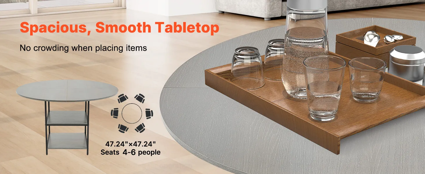 Plašs ēdamgalds: Šim apaļajam ēdamgalda modelim ir virsmas diametrs 120 cm, un tā kompaktais, taču elegantais dizains nodrošina ērtu vietu 2–4 personām, padarot to par ideālu izvēli mazākām telpām. Tā plašā virsma nodrošina pietiekami daudz vietas ēšanai, darbam, lasīšanai vai ikdienišķām sarunām, piedāvājot ērtību un komfortu ierobežotā telpā.
