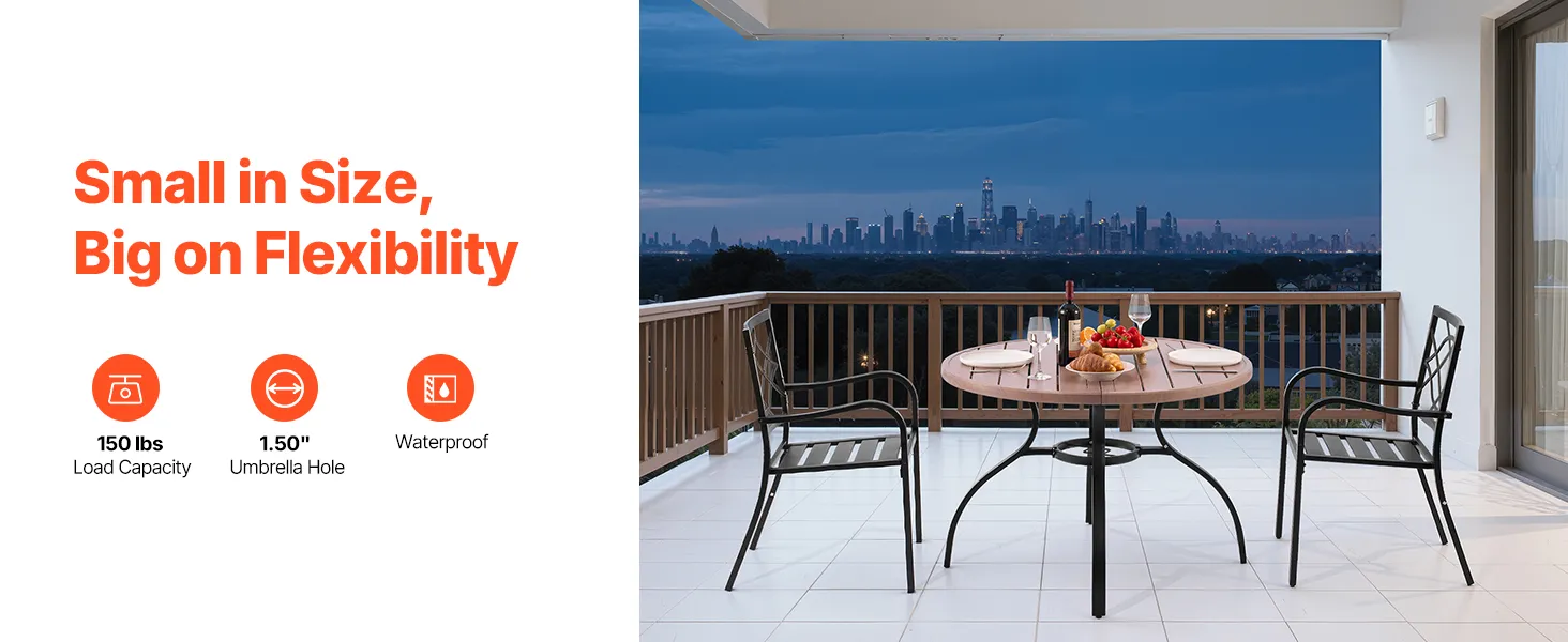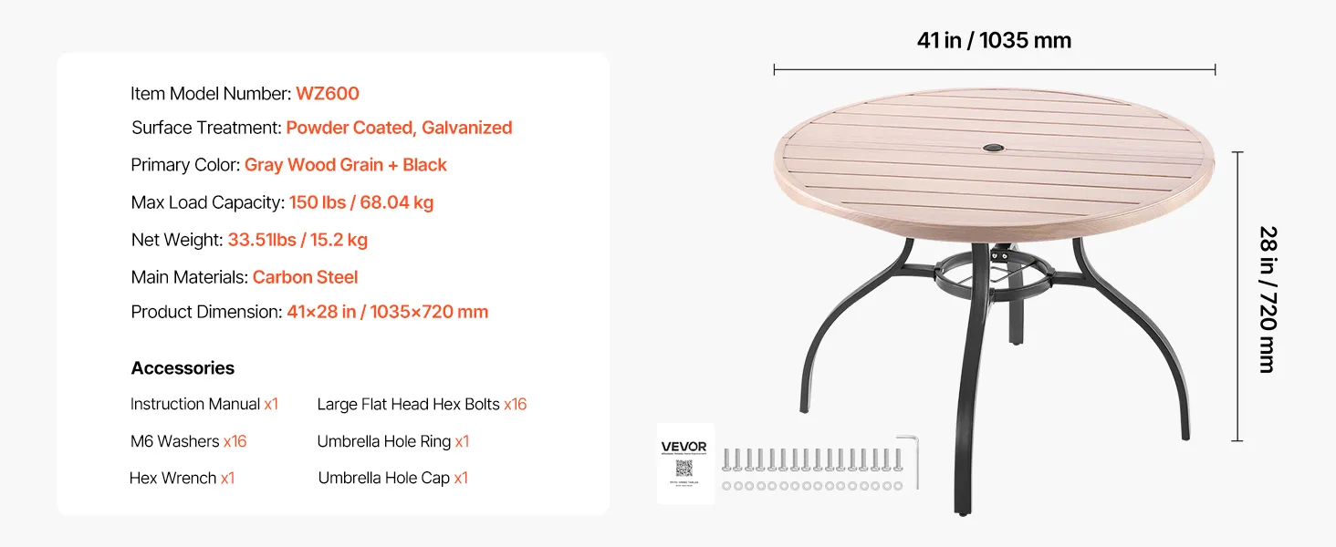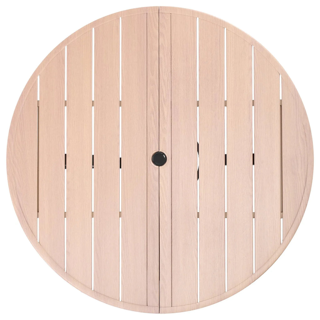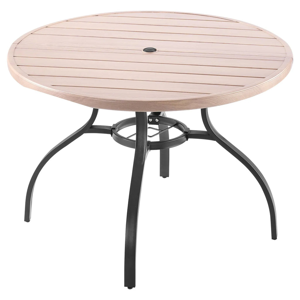 VEVOR āra apaļais dārza galds, 103 cm, tērauda slāņu konstrukcija ar koka faktūru, piemērots 4 personām, ar 38 mm saulessarga atveri, laikapstākļu izturīgs galds dārzam, terasei un pagalmam, pelēks