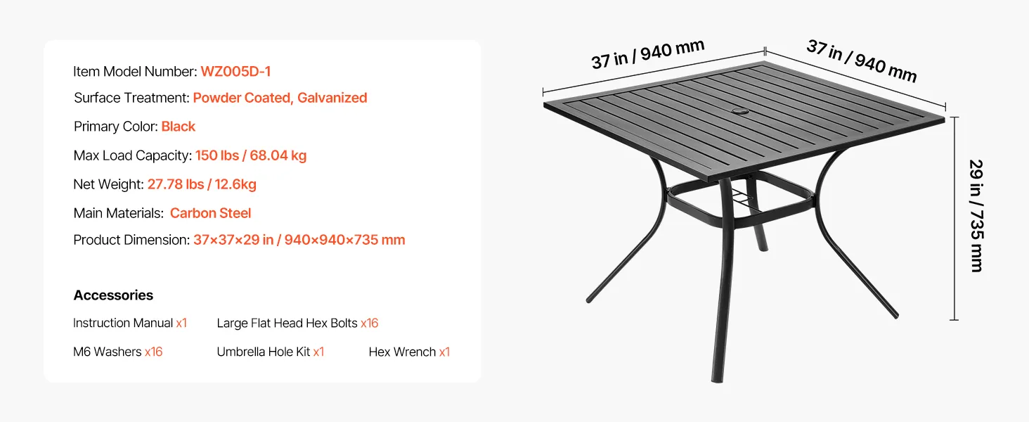 Plaša virsma: Šim āra galdam ir 940 × 940 mm galda virsma — pietiekami liela ģimenes maltītēm vai nelielām sanākšanām. Galdam pievienotas viegli saprotamas montāžas instrukcijas un viss nepieciešamais aprīkojums, lai salikšana būtu vienkārša.