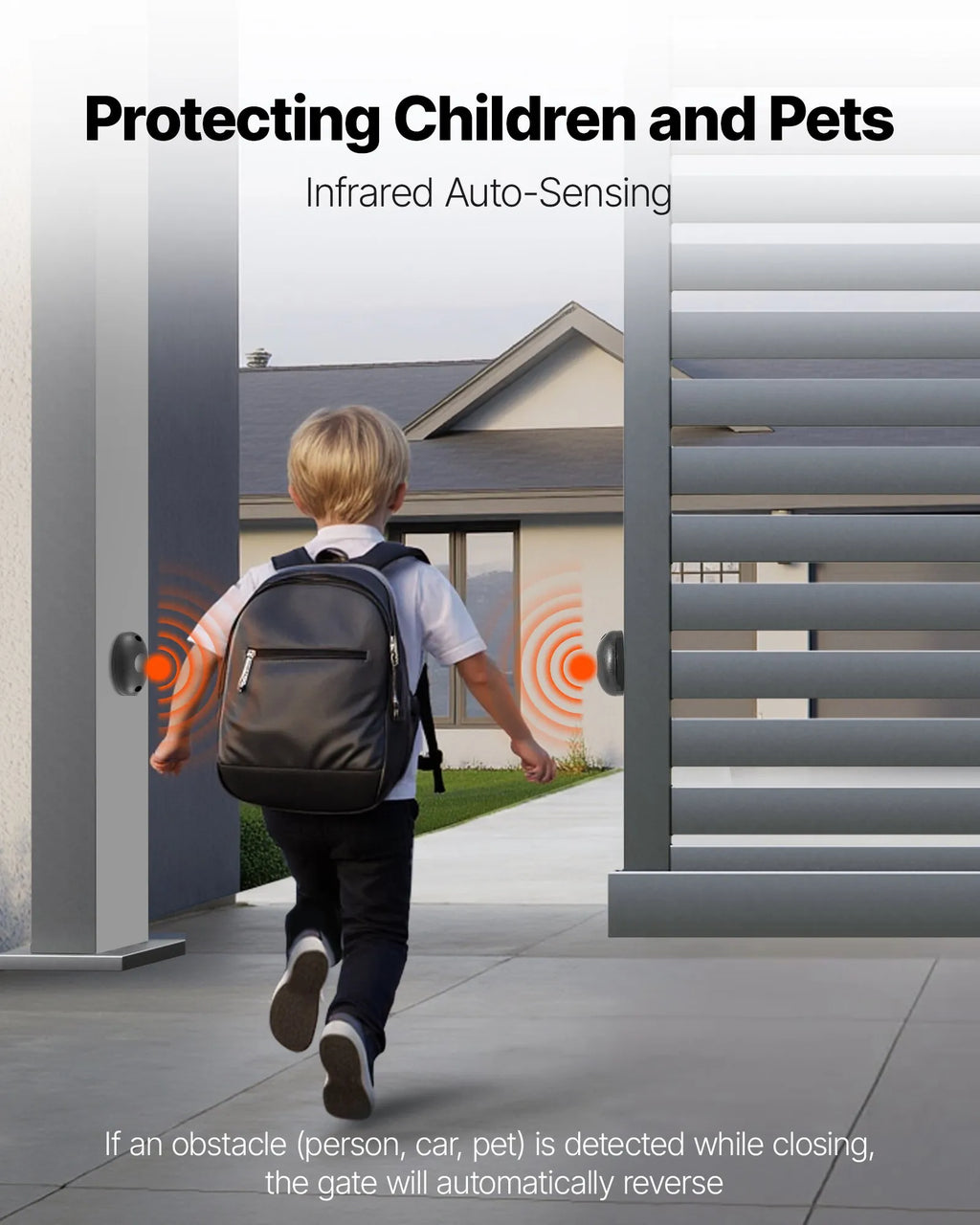 Viedās drošības funkcijas: Automātiskais vārtu atvērējs aprīkots ar infrasarkano sensoru. Ja sensors konstatē personu vai transportlīdzekli, vārti automātiski maina kustības virzienu, lai novērstu sadursmes un nodrošinātu bērnu un mājdzīvnieku drošību.