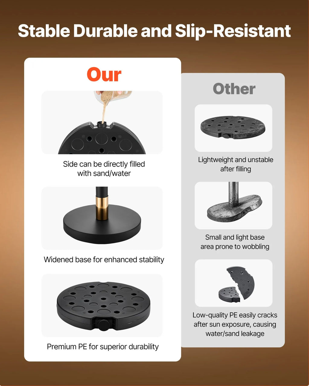 Pildāma un grīdai draudzīga pamatne: Pamatni var piepildīt ar ūdeni vai smiltīm līdz 2,6 kg vai 3,5 kg, savukārt gumijas gredzens palīdz novērst apgāšanos un aizsargā grīdu.