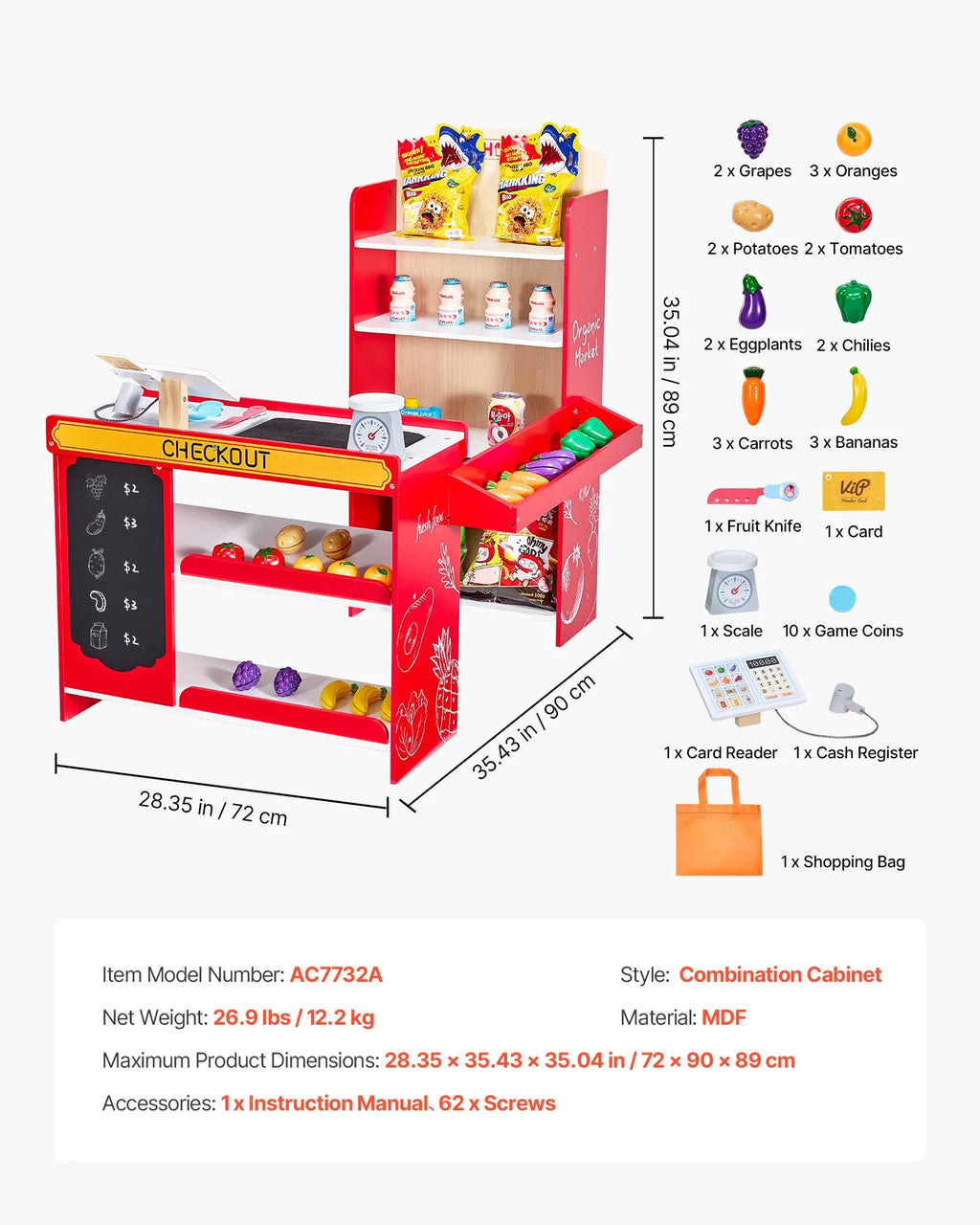 35 augstas kvalitātes piederumi: Bērnu veikala rotaļu komplektā ietilpst kases aparāts, svari, iepirkumu somas un 20 augļu un dārzeņu detaļas, nodrošinot pilnvērtīgu un aizraujošu rotaļu.