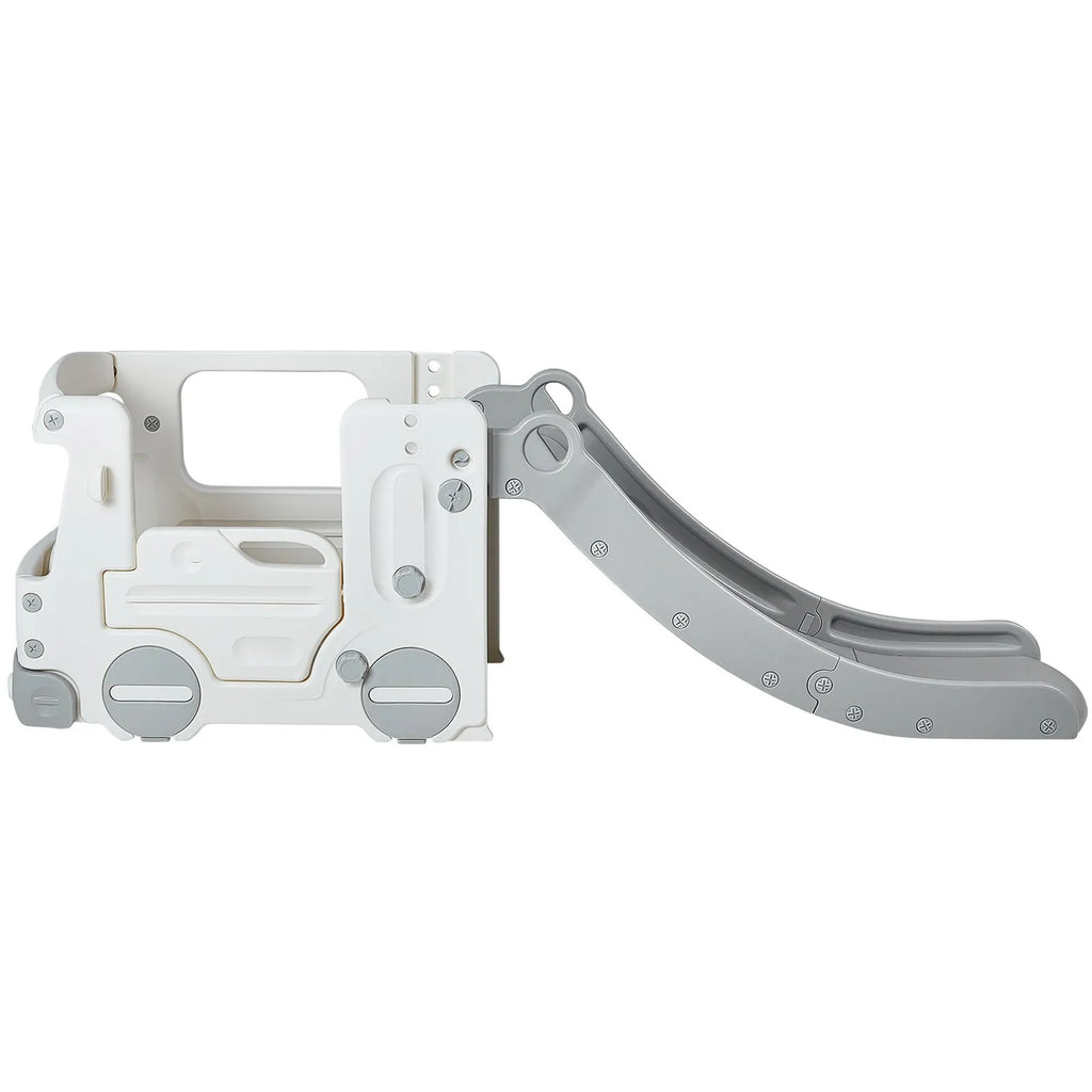 Slīdkalniņš ar kāpnītēm un atbalsta margām palīdz attīstīt bērnu kustību prasmes un koordināciju. Autobusa tematikas rotaļu namiņš rosina iztēli un sociālo mijiedarbību, padarot rotaļas gan izglītojošas, gan aizraujošas.