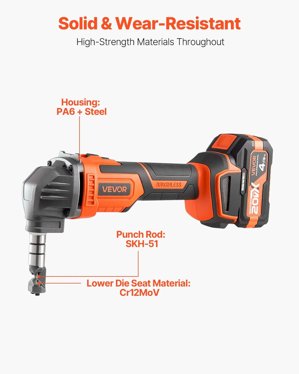 Izturīga un ilgmūžīga konstrukcija: Metāla griezējs ir izgatavots no augstas izturības materiāliem. PA6 un tērauda korpuss, SKH-51 štances stienis un Cr12MoV apakšējās formas pamatne nodrošina augstu nodilumizturību un triecienizturību.