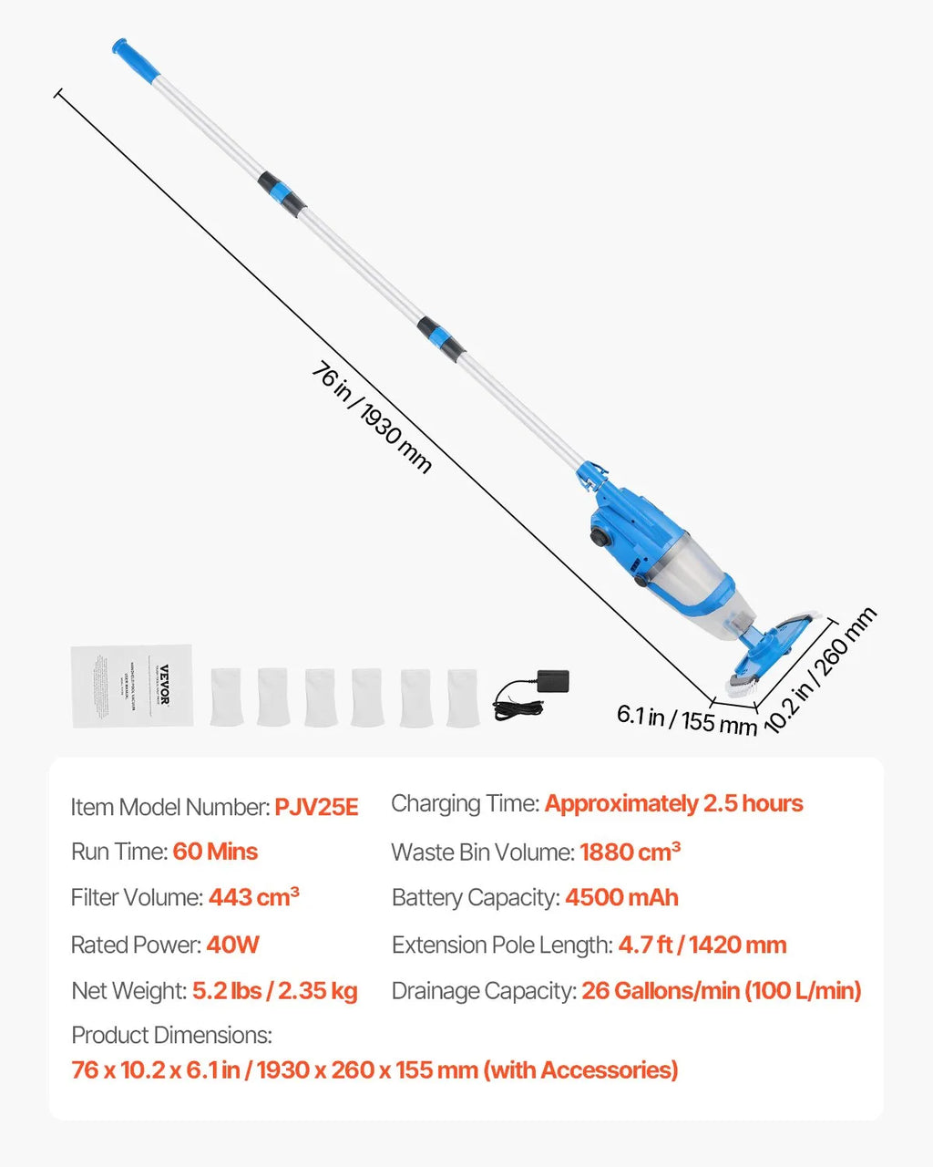 Iebūvētais 4500 mAh akumulators nodrošina līdz 60 minūtēm darbības ar vienu uzlādi, ļaujot iztīrīt visu baseinu bez vadu ierobežojumiem.