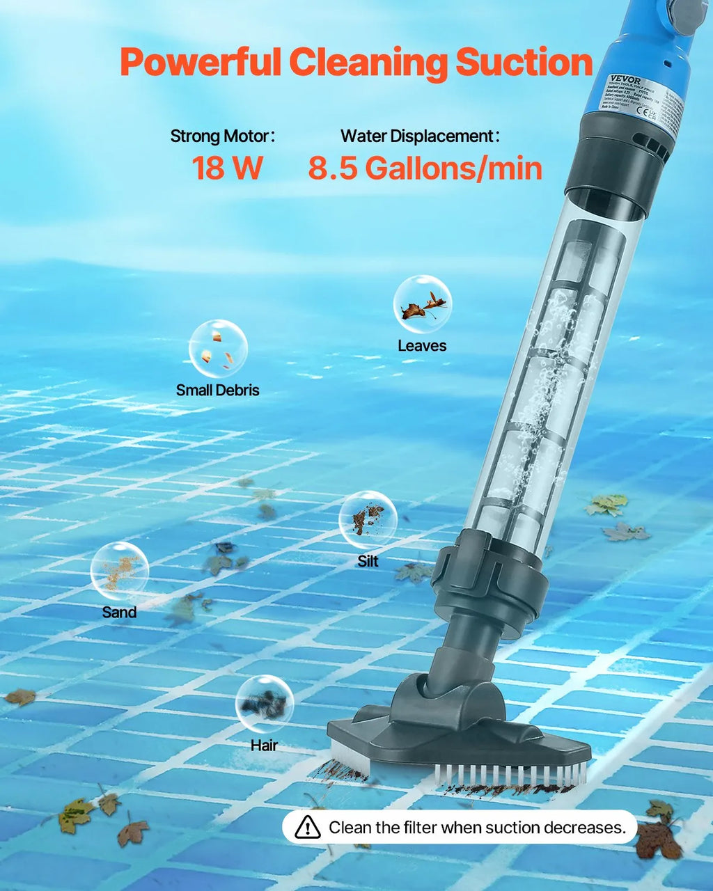 Šis bezvadu spa un burbuļvannu putekļsūcējs aprīkots ar jaudīgu 18 W motoru un nodrošina ūdens plūsmas ātrumu līdz 32 l/min (8,5 GPM), efektīvi savācot netīrumus, smiltis un gružus no baseina dibena (nav paredzēts aļģu tīrīšanai).