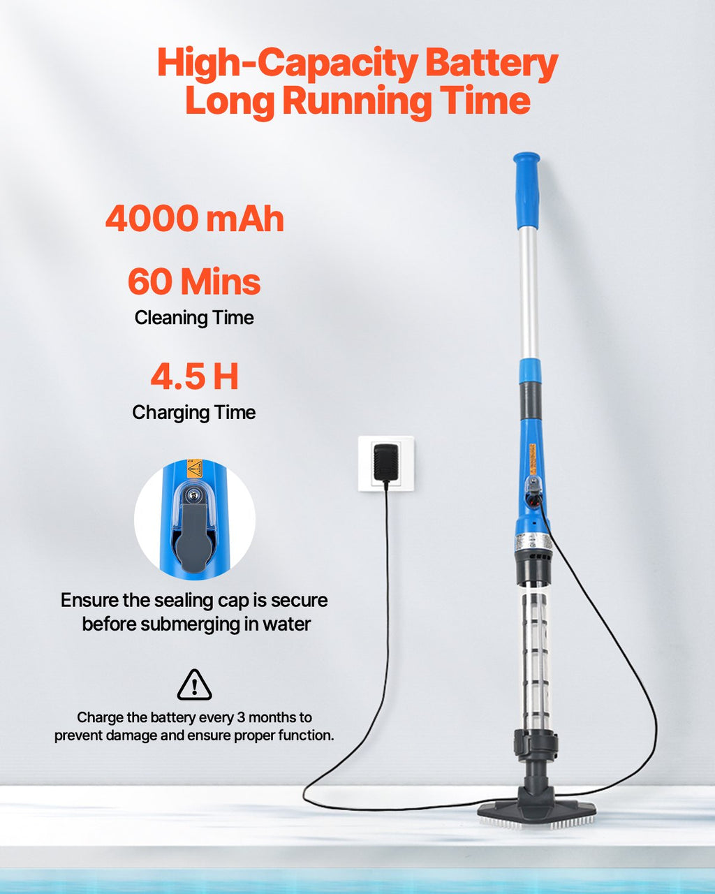 Iebūvētais 4000 mAh akumulators nodrošina līdz 60 minūtēm darbības ar vienu uzlādi, ļaujot iztīrīt visu baseinu bez vadu ierobežojumiem.