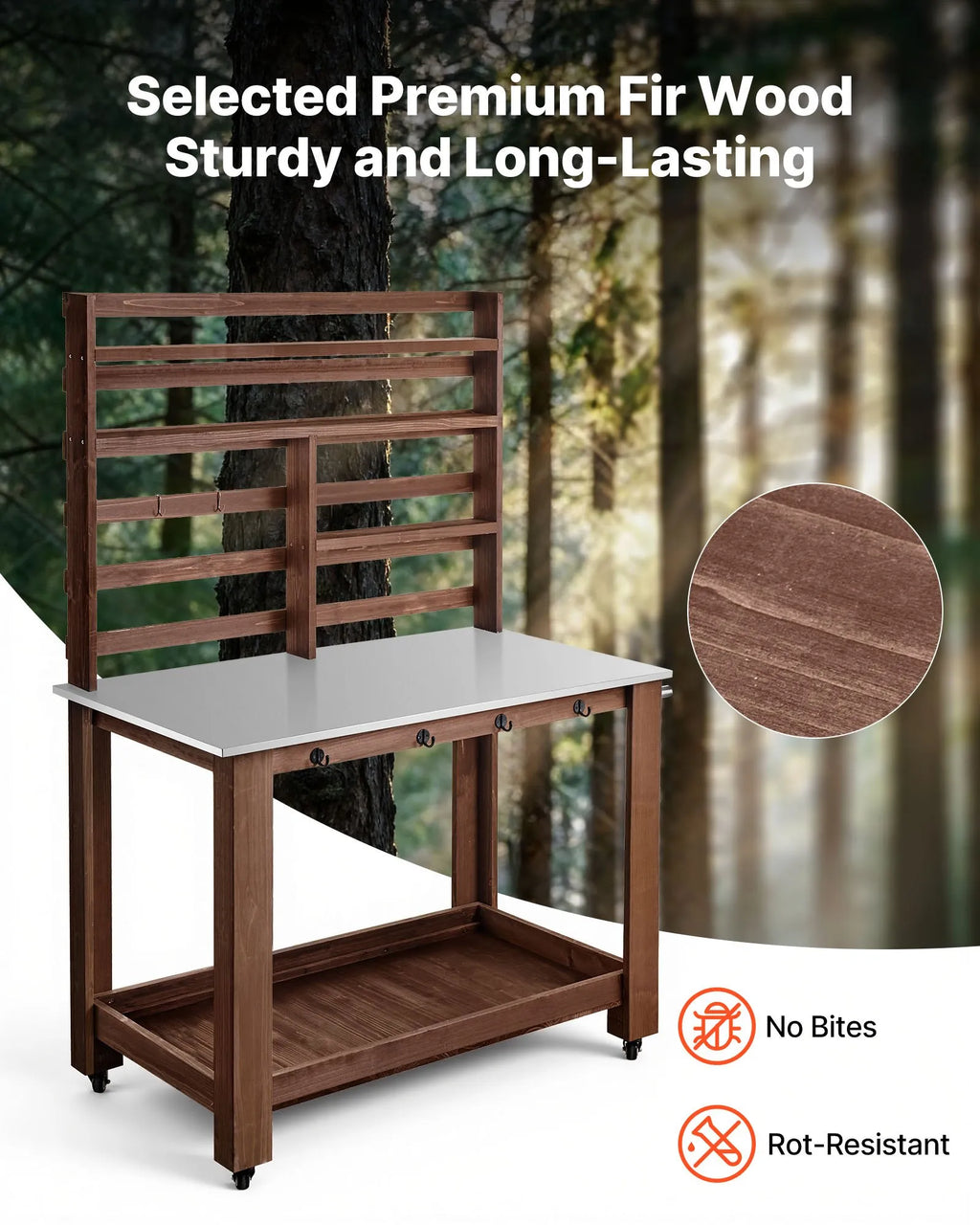 Izgatavots no augstvērtīga egles koka, mūsu stādu pārstādīšanas galds ir noturīgs pret bojājumiem un trupēšanu, nodrošinot izturību un ilgstošu kalpošanu dārza apstākļos.