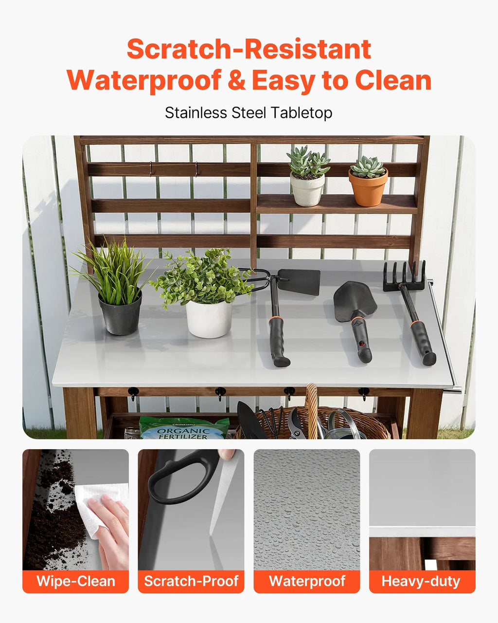 Nerūsējošā tērauda galda virsma: Āra stādu pārstādīšanas galds ir izturīgs pret ūdeni un rūsu, un to var ātri notīrīt. Ūdensizturīgā konstrukcija piemērota smagiem instrumentiem un ikdienas dārza darbiem.