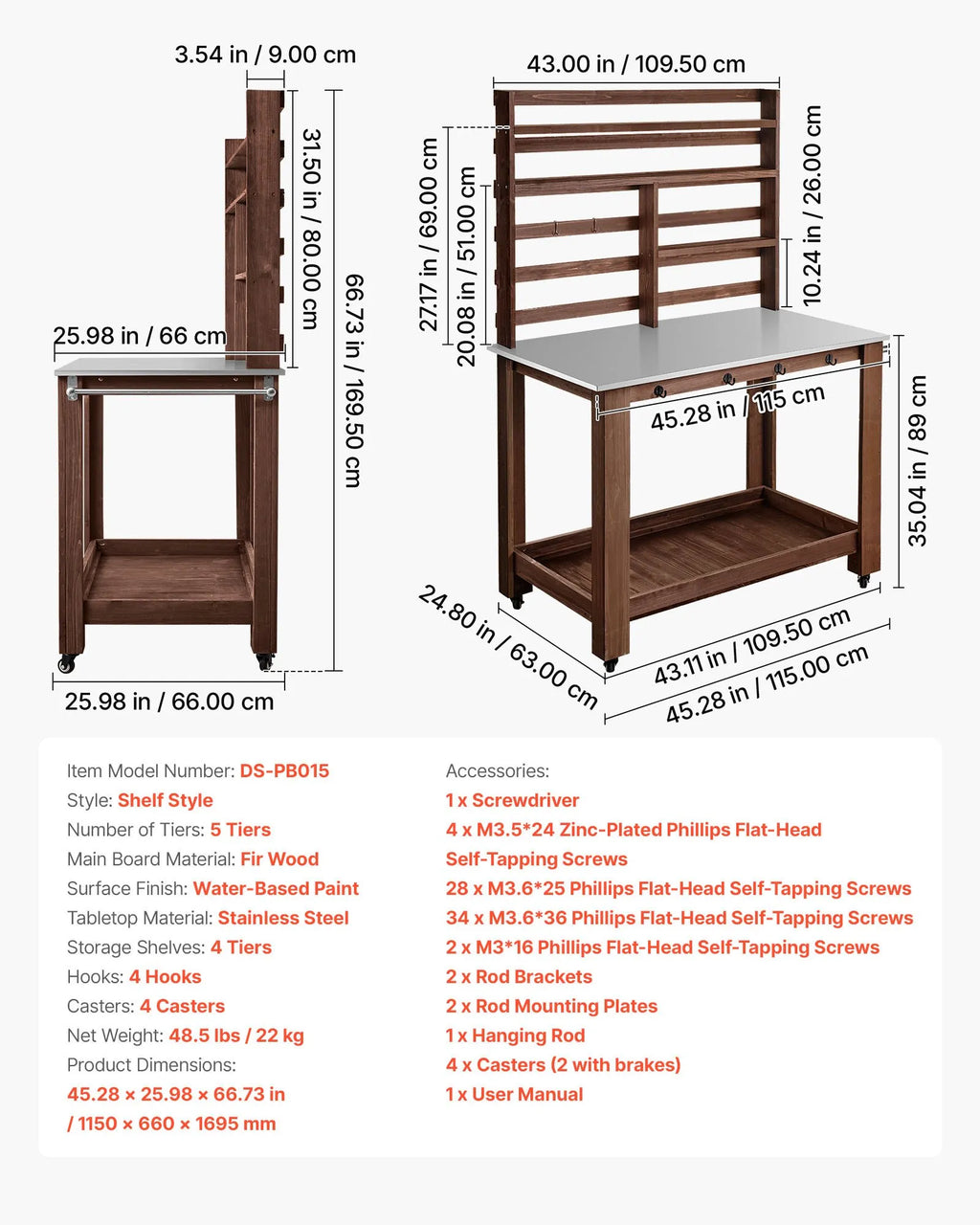 Plaša uzglabāšanas vieta: Galdam ir trīs augšējie plaukti nelielu podu izvietošanai un apakšējais plaukts lielāku instrumentu un mēslojuma uzglabāšanai. Komplektā iekļauti četri āķi dvieļu un citu priekšmetu pakarināšanai.