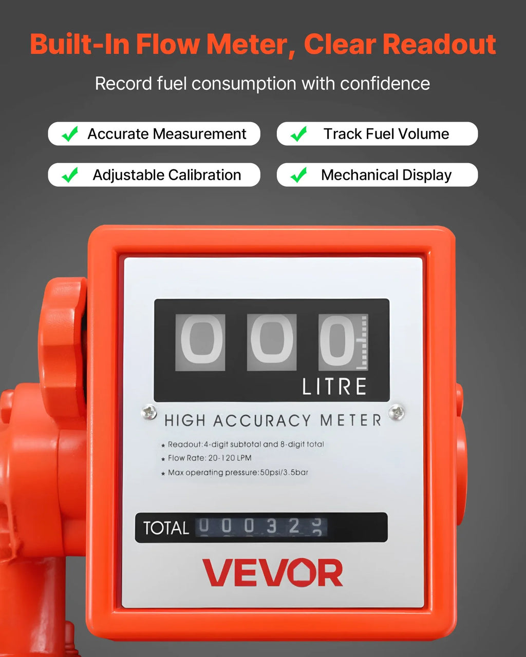 Pilns komplekts ar plūsmas skaitītāju: Komplektā ietilpst 4 m gumijas izplūdes šļūtene, 530–960 mm PVC ieplūdes šļūtene un automātiska izslēgšanās uzpildes pistole. Plūsmas skaitītājs nodrošina viegli nolasāmu degvielas daudzuma uzskaiti. Iebūvēta pārkaršanas aizsardzība nodrošina drošu ekspluatāciju.
