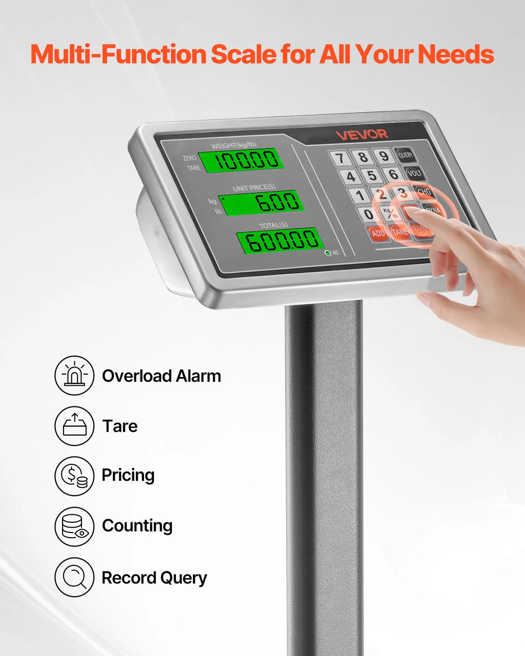 VEVOR digitālā platformas svari ar skaitļošanas funkciju, 300 kg maksimālā slodze, 50 g precizitāte, elektroniskie grīdas svari ar LB/KG, Tare, cenu kalkulatoru, AC/DC barošanu, piemēroti bagāžai, sūtījumiem un pasta pakām