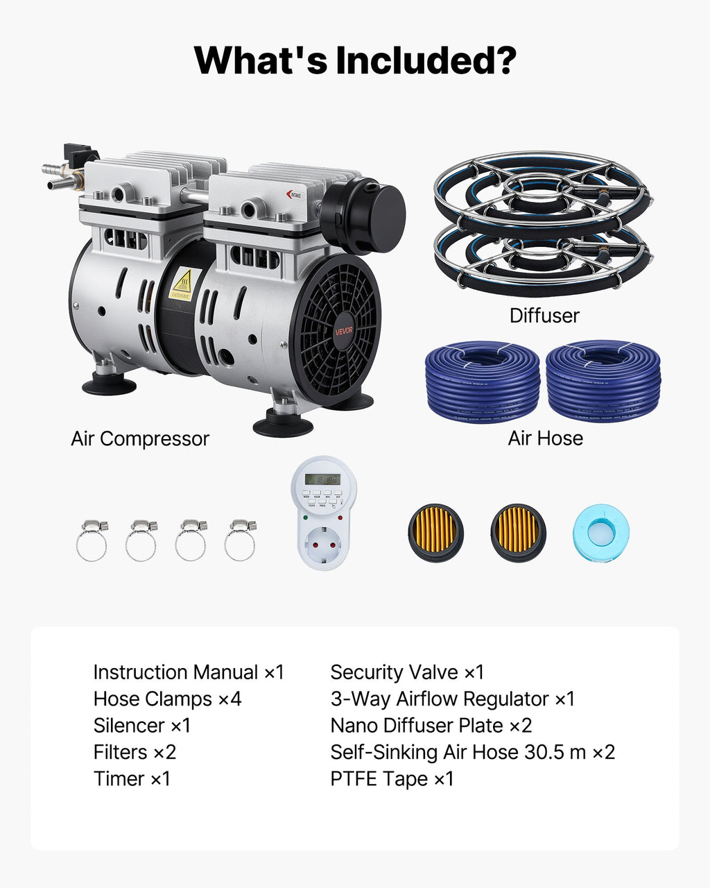Pilns komplekts: Āra dīķa aerators ietver gaisa kompresoru, 2 gab. pašnogremdējošās noslogotās šļūtenes (katra 30,5 m), 2 difuzoru plāksnes, taimeri un visus nepieciešamos piederumus. Gatavs montāžai un darbībai no standarta 220–240 V elektrotīkla.
