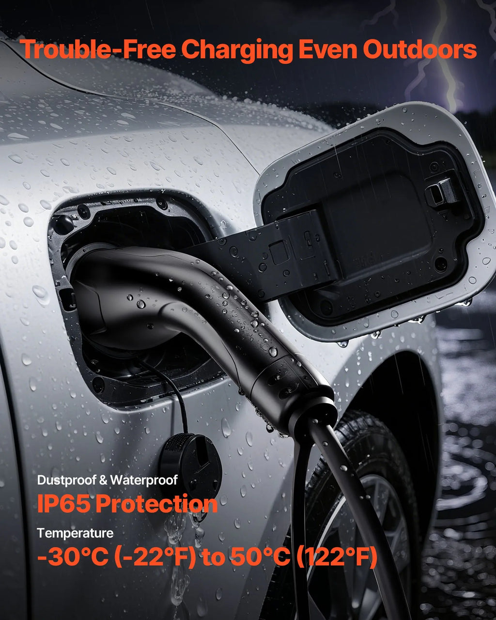 Paredzēts reāliem apstākļiem: Elektromobiļu uzlādes pagarinātāja kabelis ir izgatavots no ugunsizturīgiem materiāliem un aprīkots ar IP65 ūdensizturības aizsardzību. Tas droši darbojas temperatūrā no −30 °C līdz 50 °C — lietū vai saulē, vasarā un ziemā.