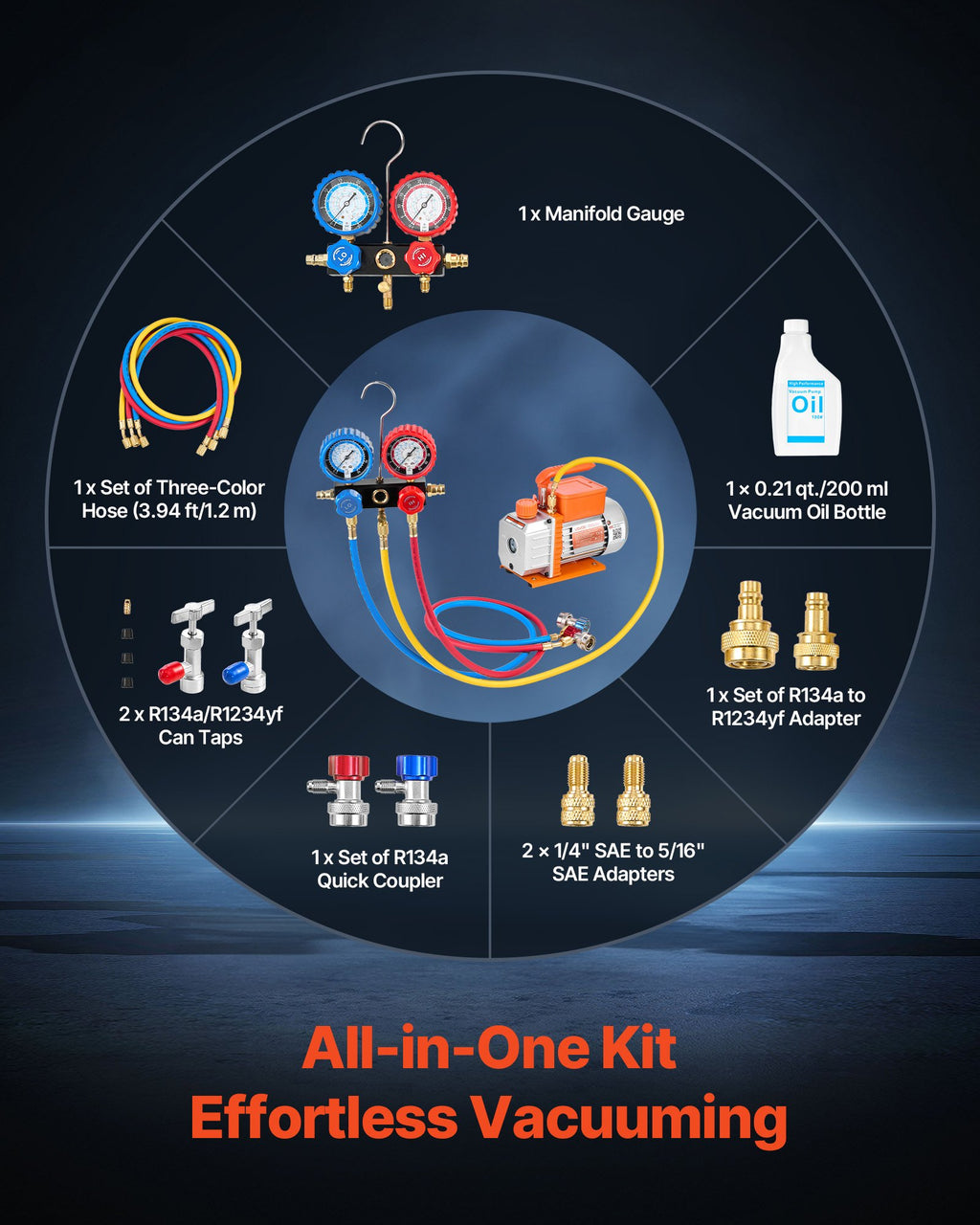 Pilns komplekts vienā iepakojumā: Komplektā ietilpst vakuumsūknis, kolektora manometru komplekts, trīskrāsu šļūtene, R134a–R1234YF adapteris, R134a ātrās pieslēgšanas savienotājs, R410a adapters (6,35 mm SAE uz 7,94 mm SAE), R134a un R1234YF balonu vārsti, 200 ml vakuuma eļļas pudele un pārnēsāšanas soma.