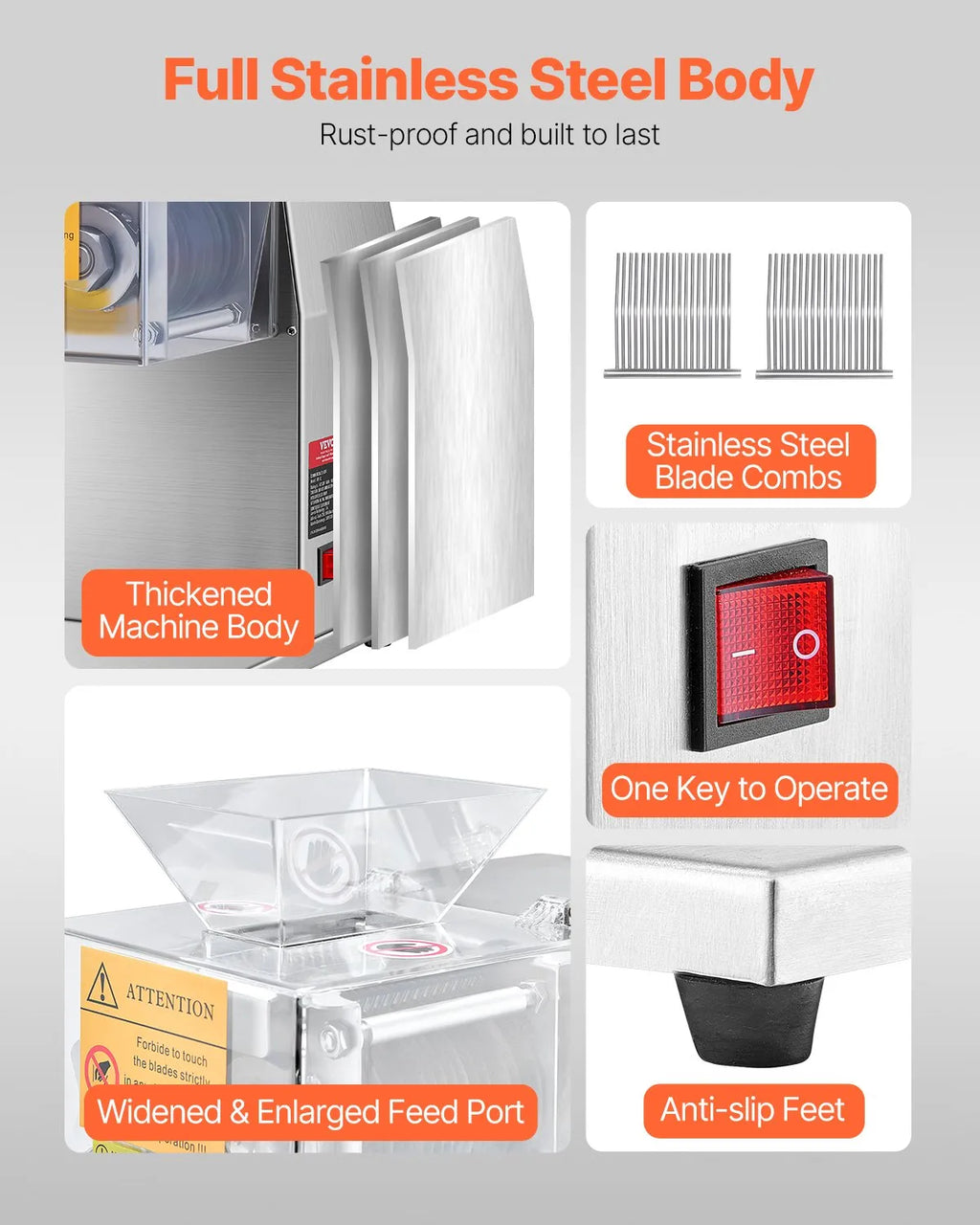 Izgatavota no augstas kvalitātes nerūsējošā tērauda, šī gaļas griešanas iekārta ir izturīga pret koroziju un nodrošina ilgu kalpošanas laiku. Neslīdoša gumijas pamatne nodrošina stabilitāti darba laikā, padarot to piemērotu mazajiem uzņēmumiem, zemnieku tirdziņiem, restorāniem un mājas virtuvēm.