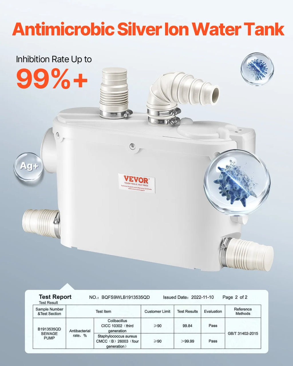 VEVOR kanalizācijas smalcinātājsūknis 500 W, plūsma līdz 6600 l/h, pacelšanas augstums līdz 8 m, ar 3 ūdens pieslēgumiem tualetei, virtuvei, izlietnei, dušai un vannai