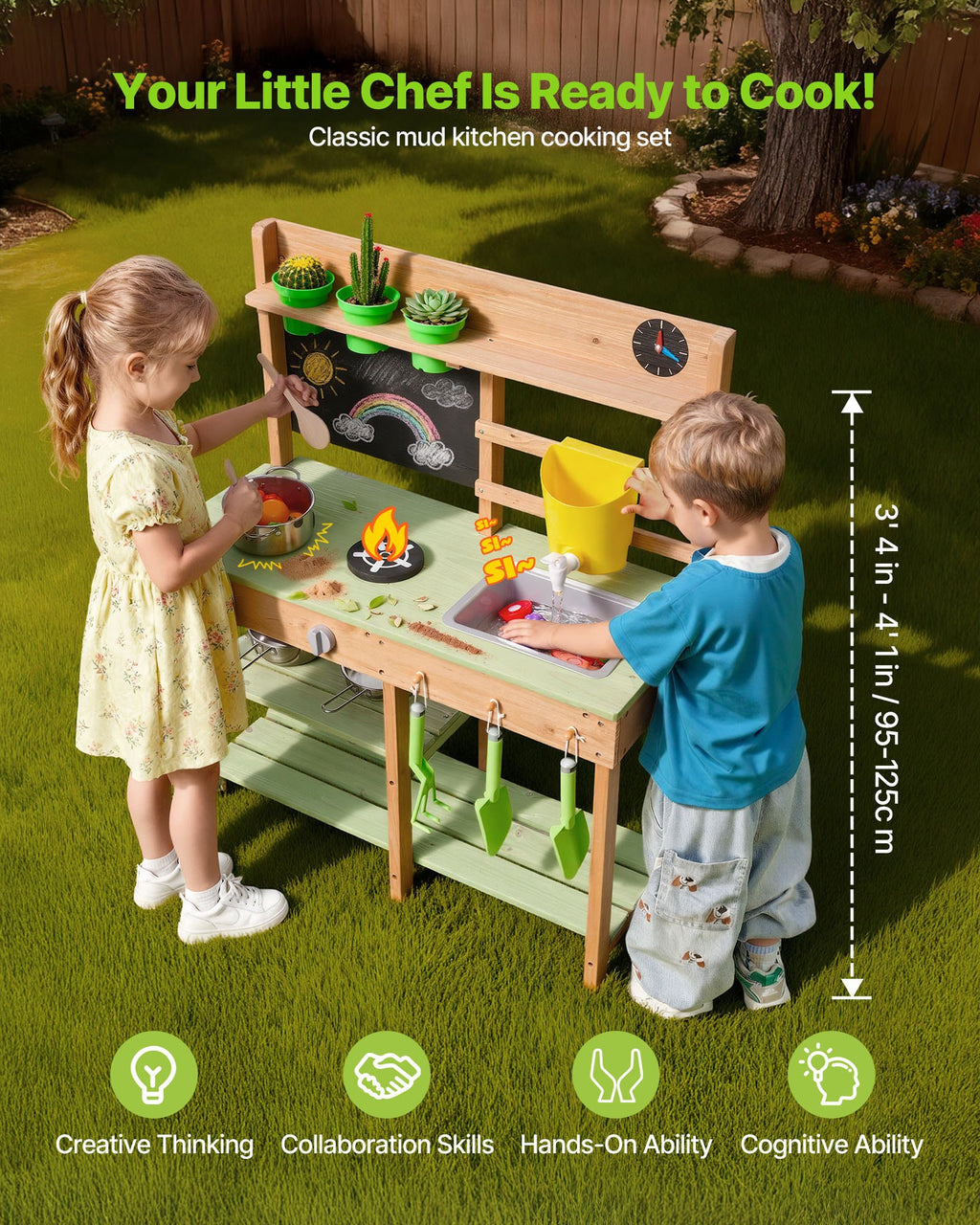 Augstas kvalitātes un izturīga konstrukcija: Izgatavota no kvalitatīva egles koka, šī izturīgā dubļu virtuve ir noturīga pret koroziju, plaisāšanu un deformāciju. Gludi krāsotās virsmas ir bez skabargām, nodrošinot drošu rotaļu ārā bērniem no 3 gadu vecuma.
