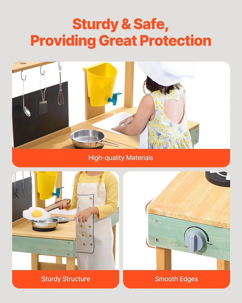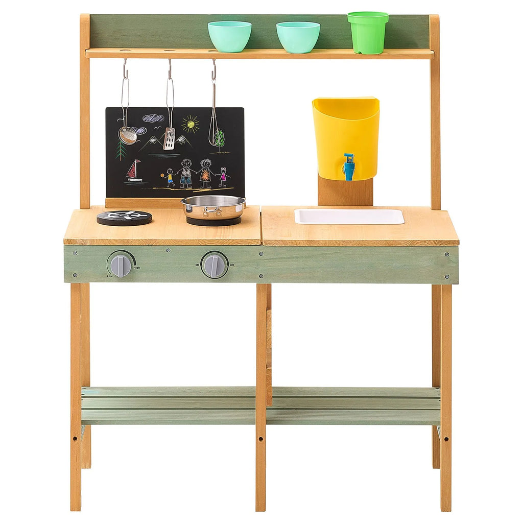 Šī radošā mazuļu rotaļu virtuve ir apstrādāta ar āra apstākļiem paredzētu krāsu, kas nodrošina ūdens un korozijas izturību, padarot to ideāli piemērotu lietošanai dārzos, pagalmos un uz zāliena.